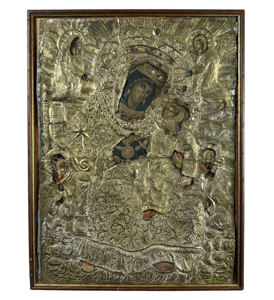 Icona, oggetto sacro decorativo, periodo XIX secolo in metallo argentato a rilievio. Dimensioni compreso cornice: 50x65 cm. Dimensioni interno cornice: 45x62 cm. Opera in buone condizioni con lievi segni di vissuto come da foto allegate.