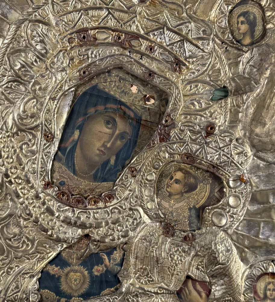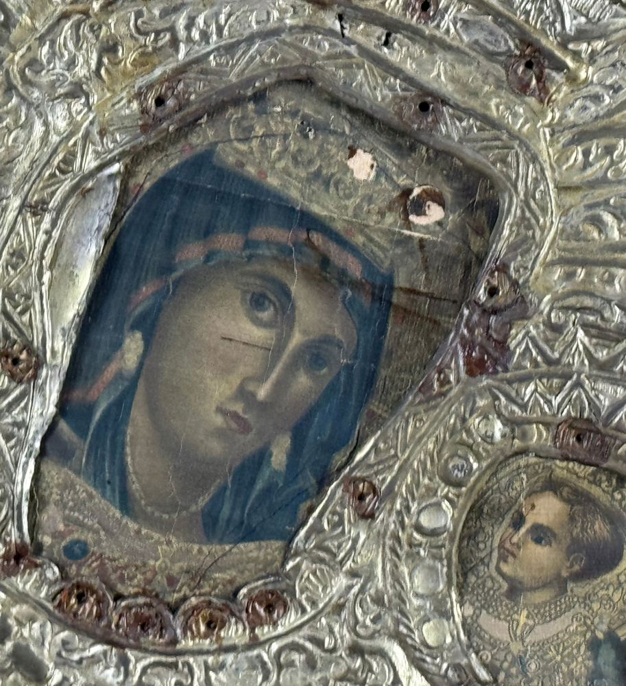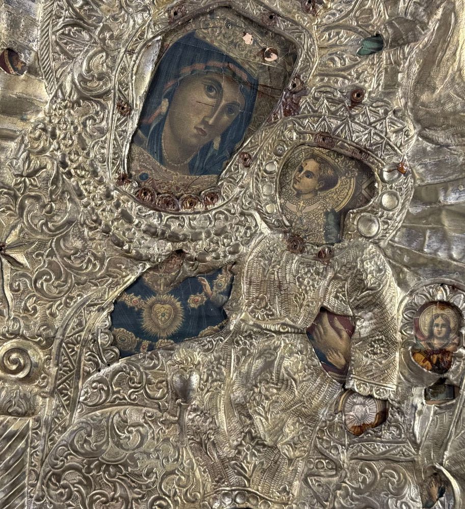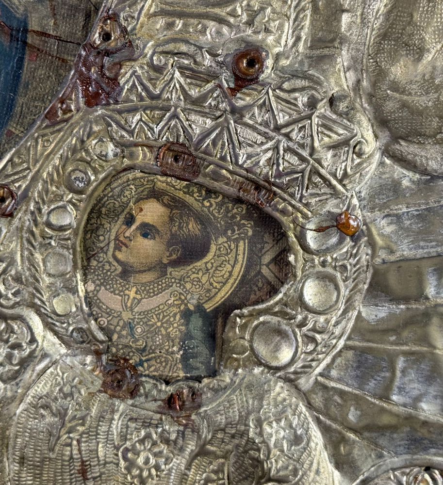 Icona, oggetto sacro decorativo, periodo XIX secolo in metallo argentato a...