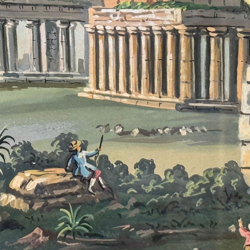 Dipinto guazzo (tempera su carta), periodo inizio XX secolo scuola Italiana, raffigurante I templi di Paestum. Dimensioni interno cornice: 48x38 cm. Dimensioni compreso cornice: 63x53 cm. Reca firma in basso a destra da artista non identificato. Opera in buone condizioni con lievi segni di vissuto come da foto allegate.