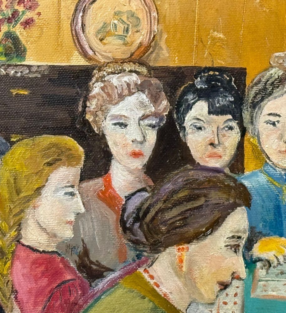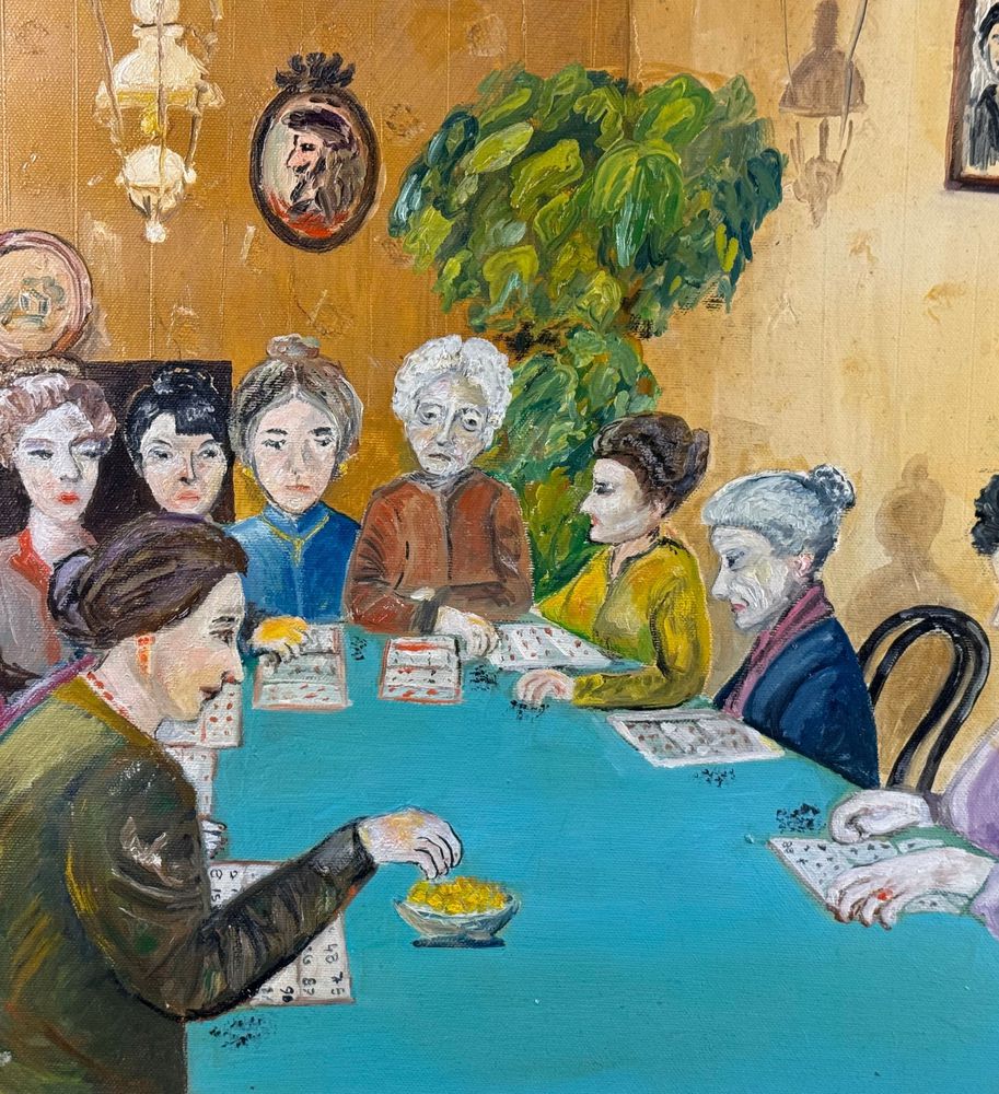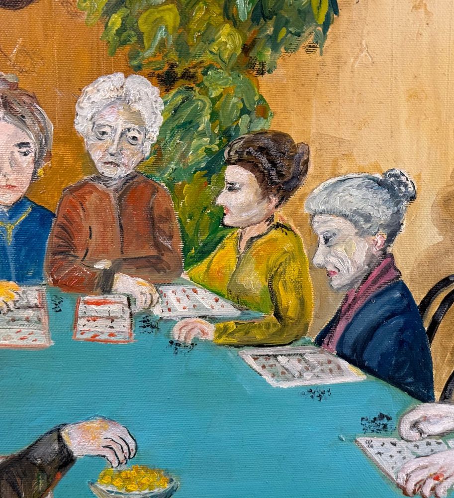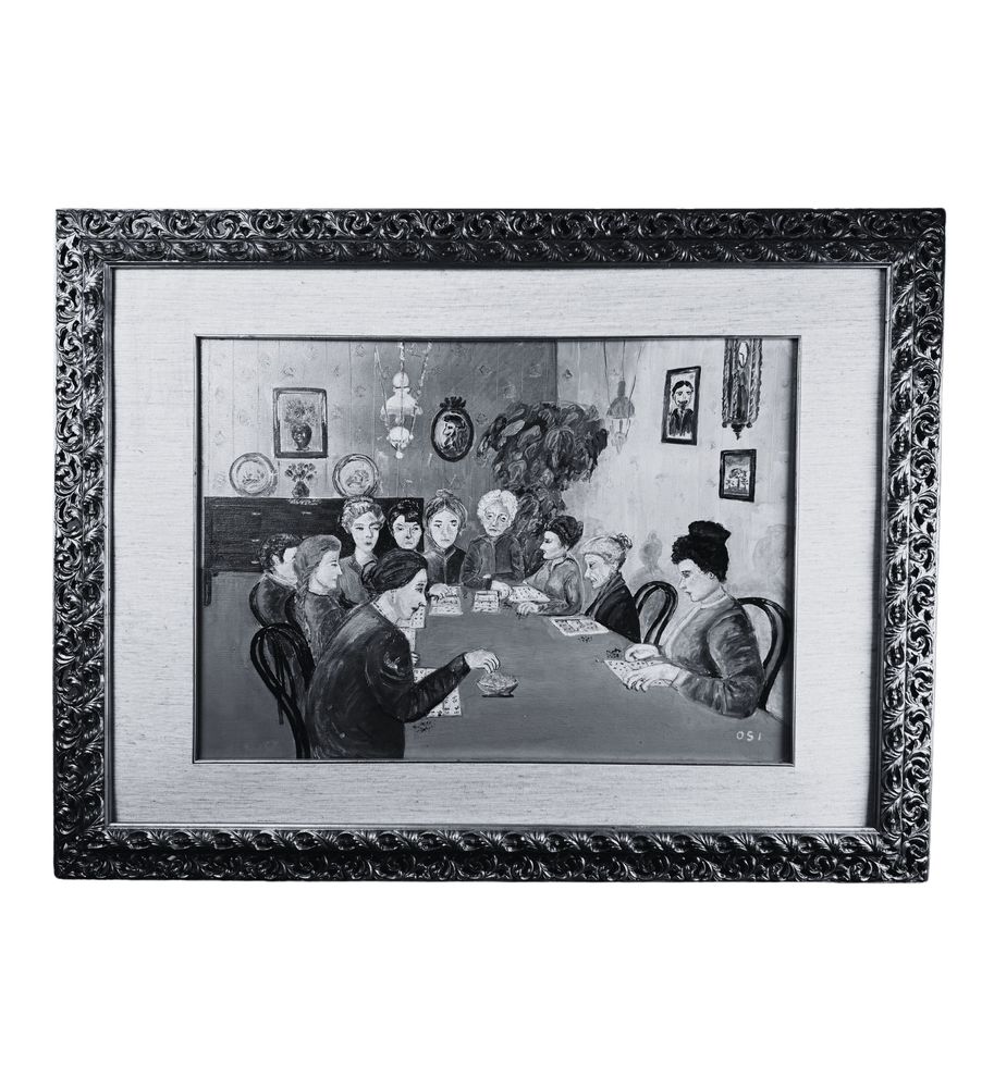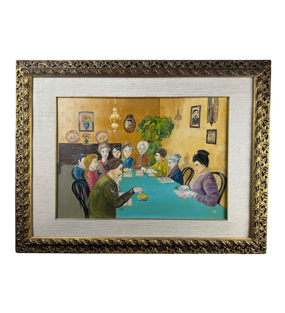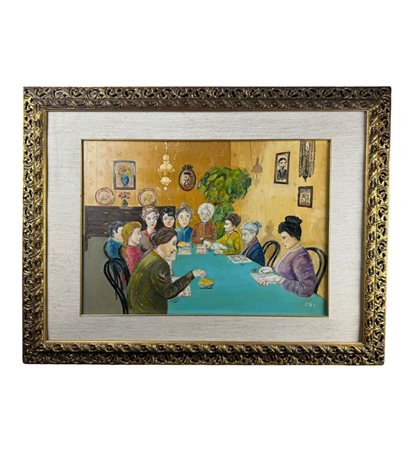 Dipinto olio su tela, periodo XX secolo scuola Italiana, raffigurante La Tombola delle Signore. Dimensioni compreso cornice: 102x78 cm. Dimensioni interno cornice: 70x50 cm. Reca firma in basso a destra da artista non identificato. Opera in buone condizioni.