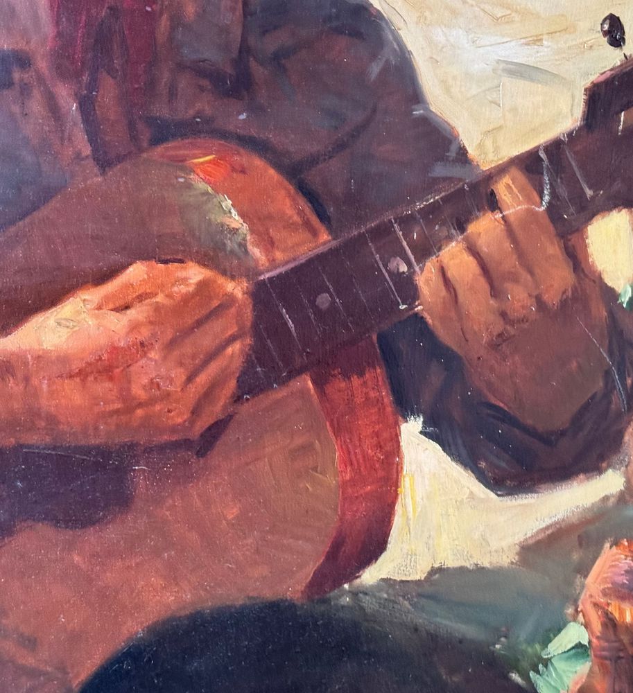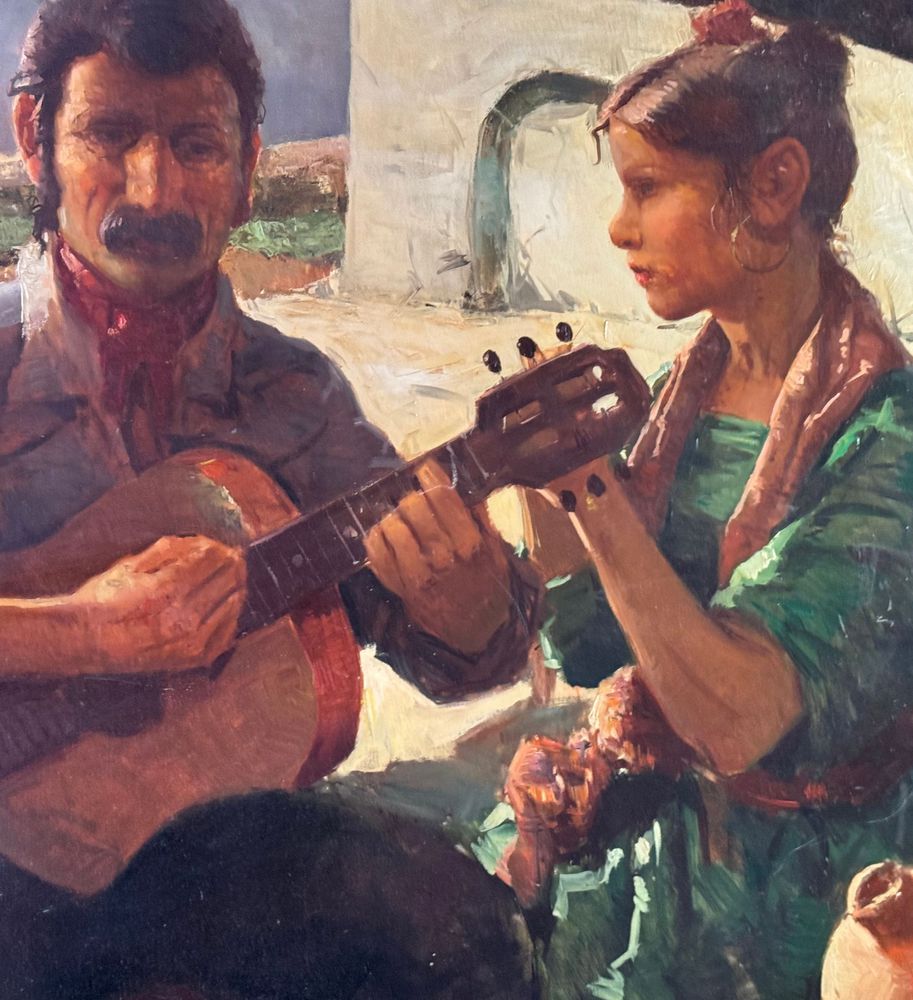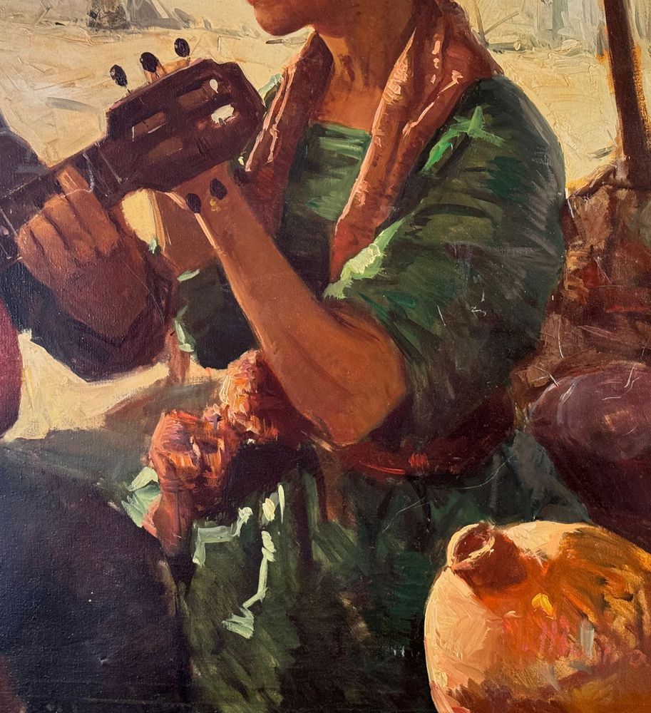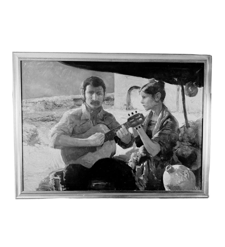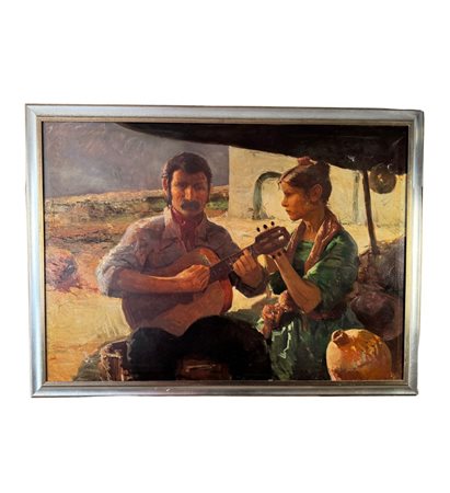 Dipinto olio su tela, periodo XX secolo scuola Italiana, raffigurante Due personaggi. Dimensioni compreso cornice: 154x113 cm. Dimensioni interno cornice: 140x100 cm. Reca firma in basso a destra da Tonino Manna. Opera in buone condizioni. Da segnalare tre piccoli punti di restauro alla tela.