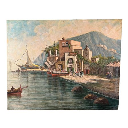 Dipinto olio su tela, periodo XX secolo scuola Italiana, raffigurante Marina con barche e personaggi. Opera attribuita a Ezelino Briante. Dimensioni: 100x80 cm Da artista anonimo.