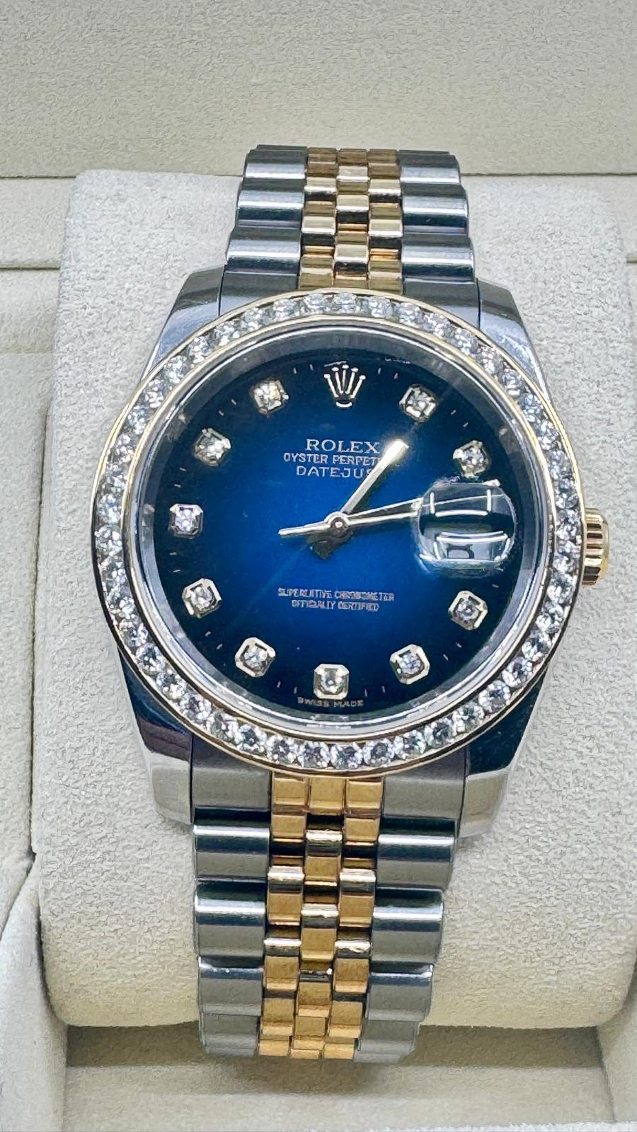 Marca Rolex Modello (Orologio) Datejust 36 Numero di referenza 116233 Quadrante con degrade con diamanti Lunetta aftermarket con diamanti veri Carica Automatico Materiale della cassa Oro/Acciaio Materiale cinturino Oro/acciaio Anno 2005 Condizione Usato (Ottimo) L'articolo presenta segni di usura lievi, come ad esempio graffi leggeri, ma non percepibili al tatto. Corredo documenti originali, no box la scatola utilizzata solo per fotografie non in vendita Diametro 36 mm Impermeabile 10 ATM Materiale lunetta Oro giallo Vetro Vetro zaffiro Cinturino Materiale cinturino Oro/acciaio Colore cinturino Oro/acciaio