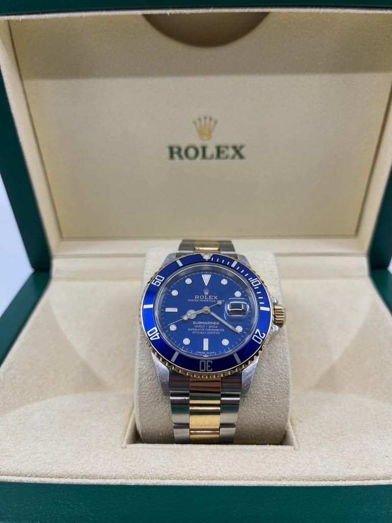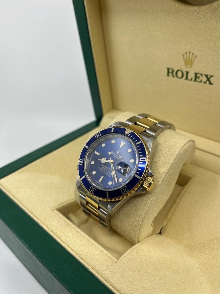 ROLEX Modello (Orologio) Submariner Date Numero di referenza 16613 Carica Automatico Materiale della cassa Acciaio Materiale cinturino Oro/acciaio Anni '90 Corredo documenti originali Rolex no box Carica Automatico Cassa Materiale della cassa Acciaio Diametro 40 mm Impermeabile 30 ATM Vetro zaffiro Quadrante Blu Numeri sul quadrante Senza numeri Materiale cinturino Oro/acciaio Colore cinturino Oro/acciaio Chiusura Déployante Materiale chiusura Oro/Acciaio Funzioni Data