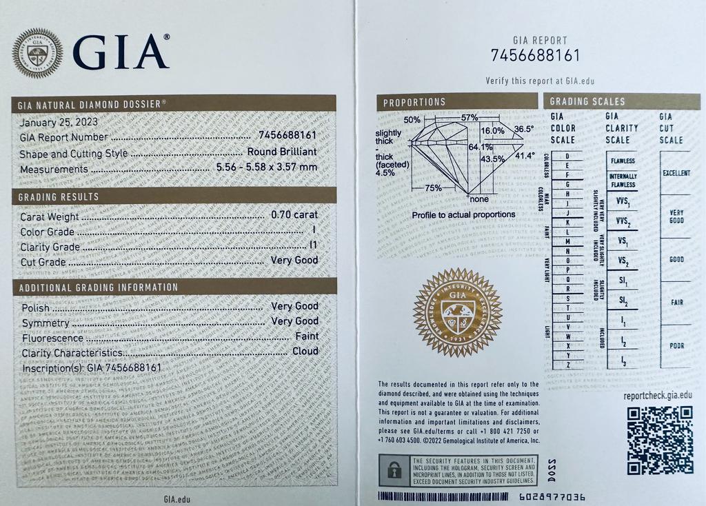 DIAMANTE 0,7 CARATI COLORE I - PUREZZA I1 - TAGLIO BRILLANTE - CERTIFICATO GIA - PUREZZA SF31011