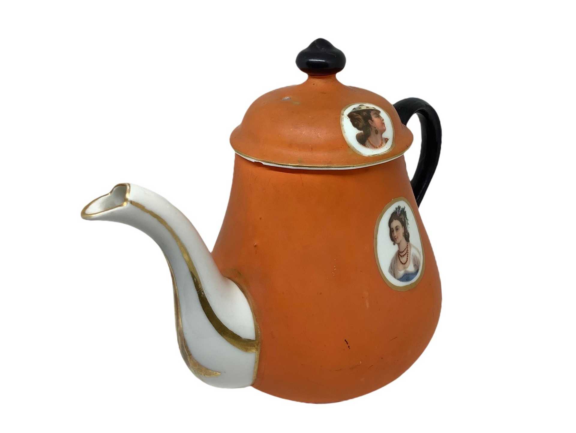 Caffettiera in porcellana con damine recto-verso e sul coperchio, 20° secolo h 20 cm Piccola incoll