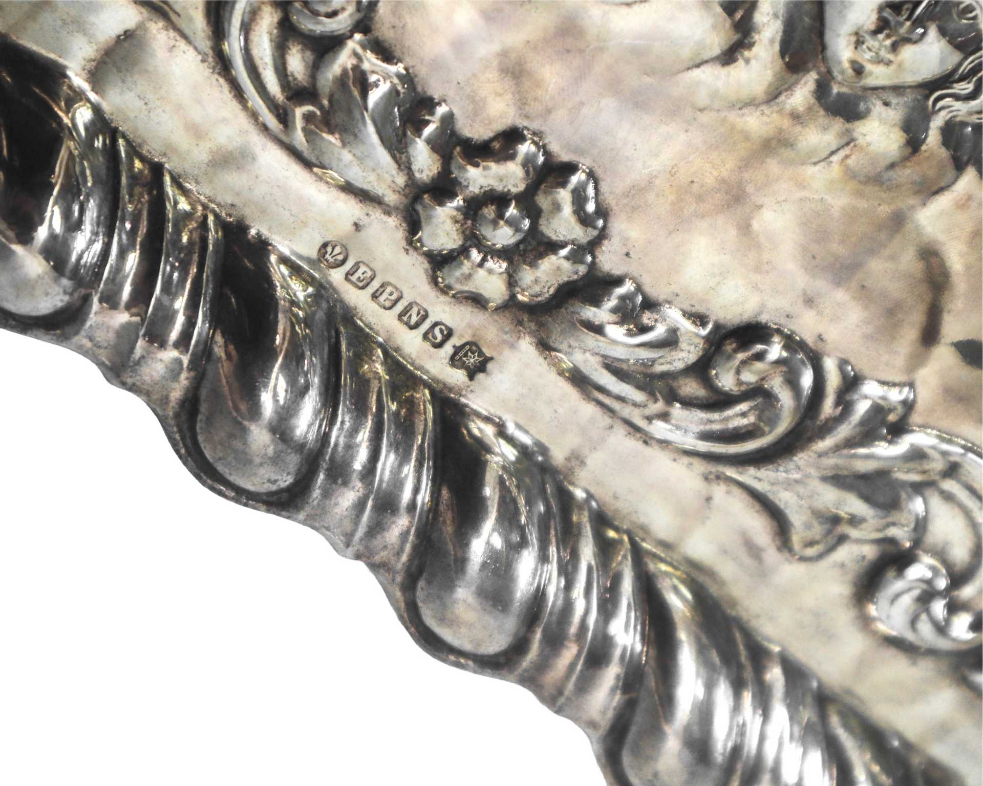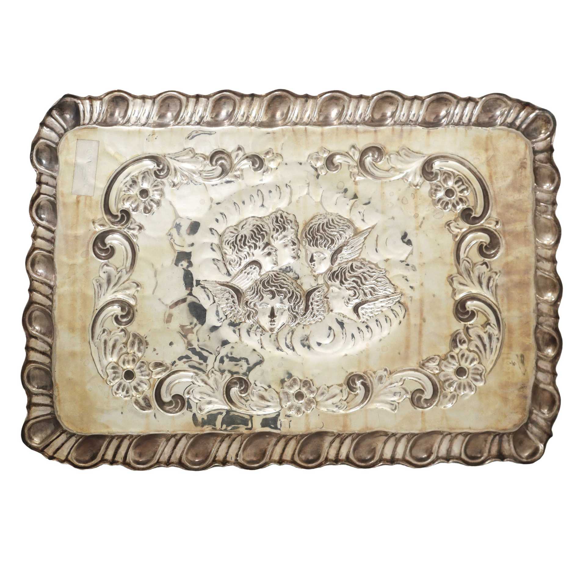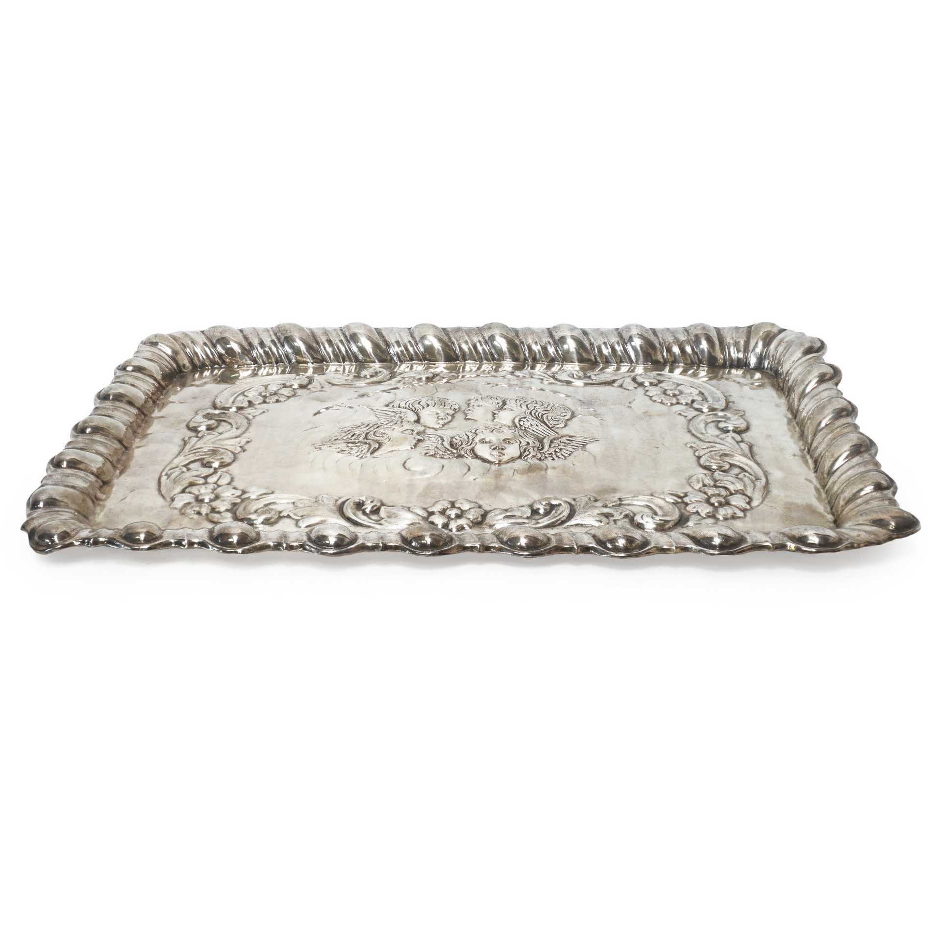 Vassoietto in epns sbalzato con teste di Zefiri cm 30,5X20 Inciso sul fronte marchio EPNS (electro