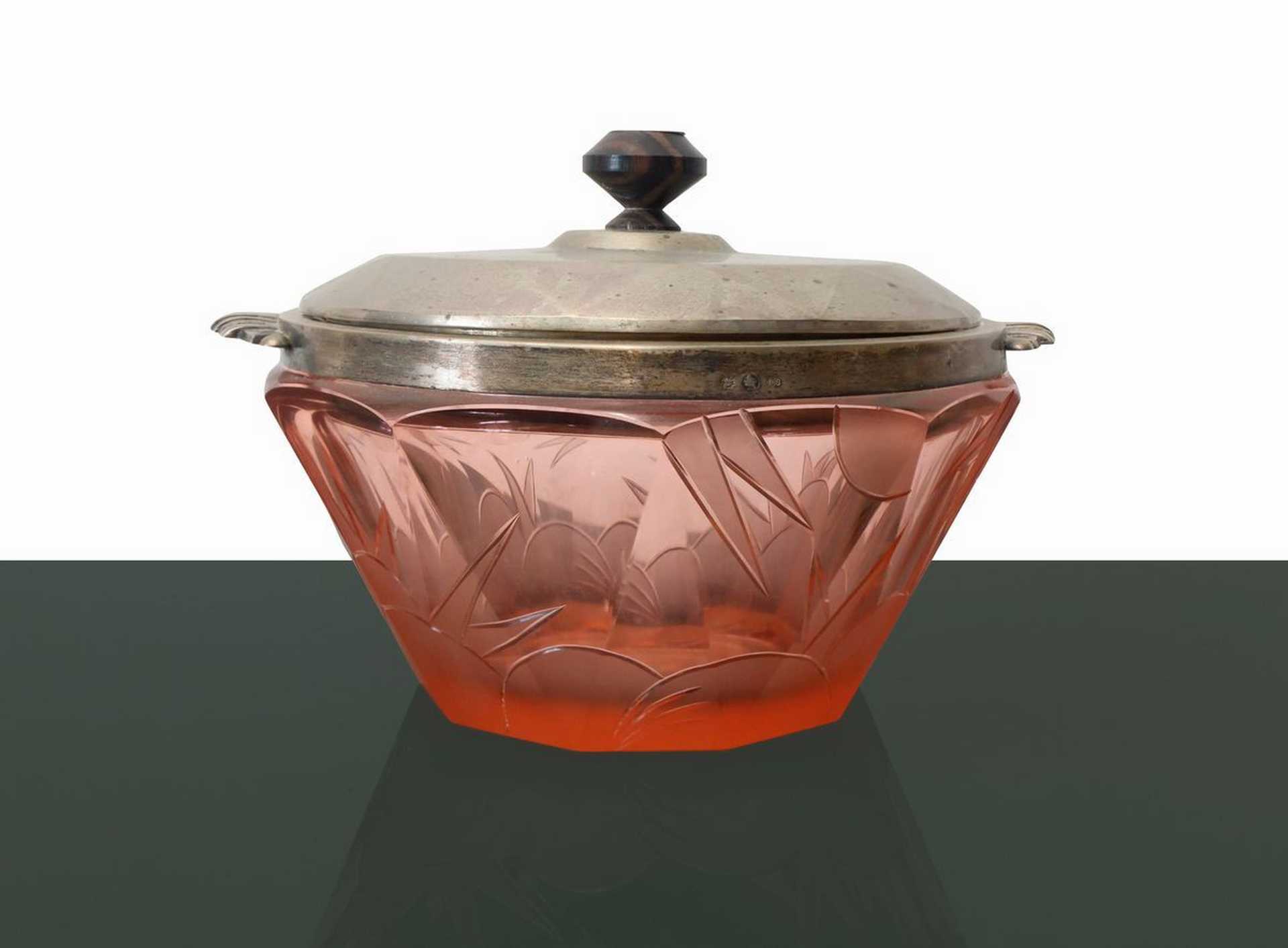 Argentiere Filippo Chiappe - Biscottiera in vetro molato rosa con coperchio in argento 900, Deco