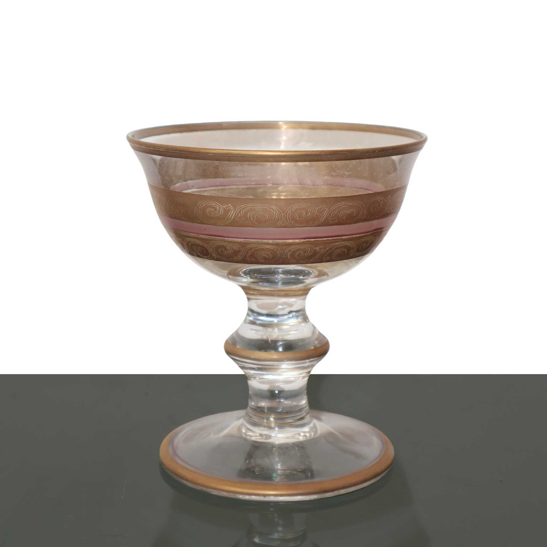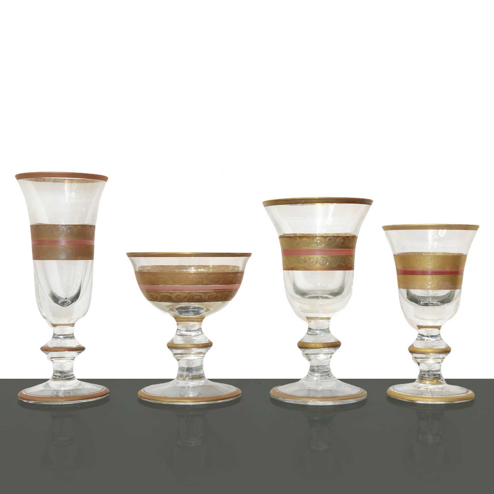 Servizio di bicchieri da 12 in vetro di Murano con dettaglio in oro e rosa.