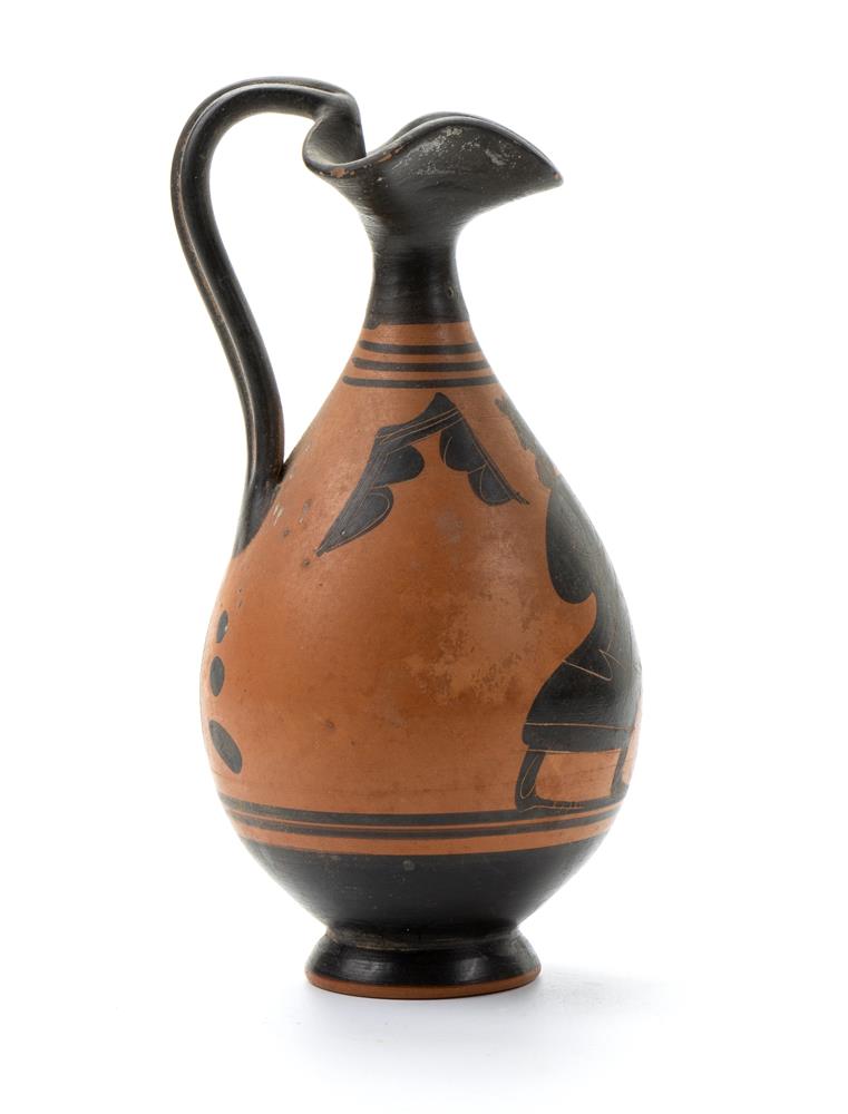 Piccolo oinochoe con becco carenato in ceramica arcaica a figure rosse con sacerdotessa con sonaglio di cibele