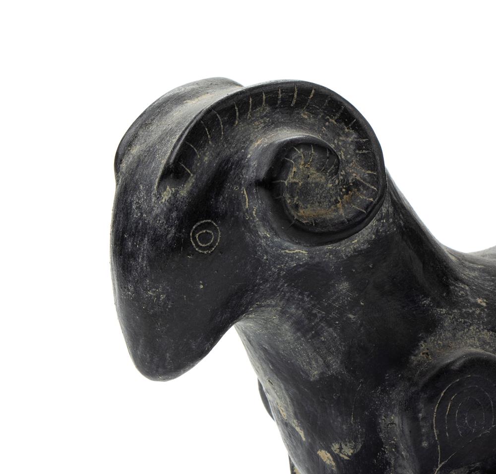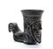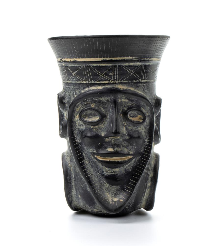 Kantnharos in ceramica buccheroide a forma di corno potorio con mascherone antropomorfo al fronte ed ariente nella parte finale XX secolo