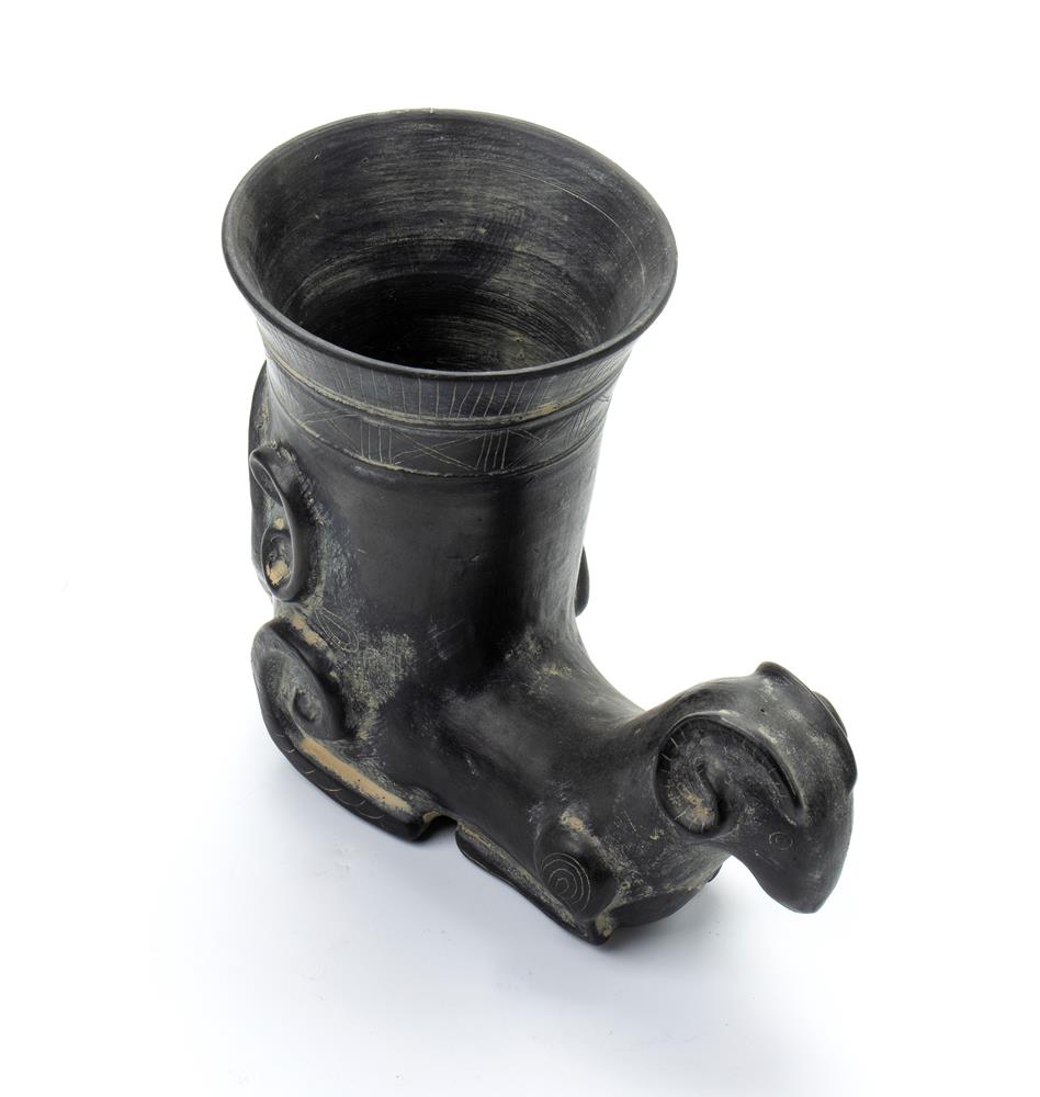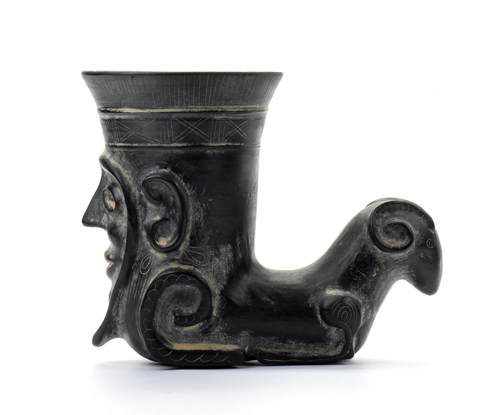 Kantnharos in ceramica buccheroide a forma di corno potorio con mascherone antropomorfo al fronte ed ariente nella parte finale