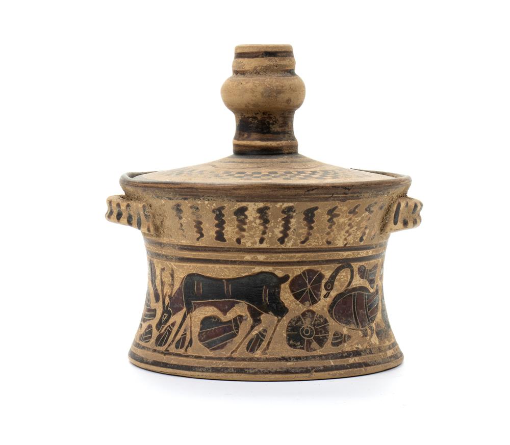 Urna cilindrica rastremata in ceramica arcaica a figure nere con decorazioni zoomorfiche sul corpo e geometriche sul coperchio XX secolo