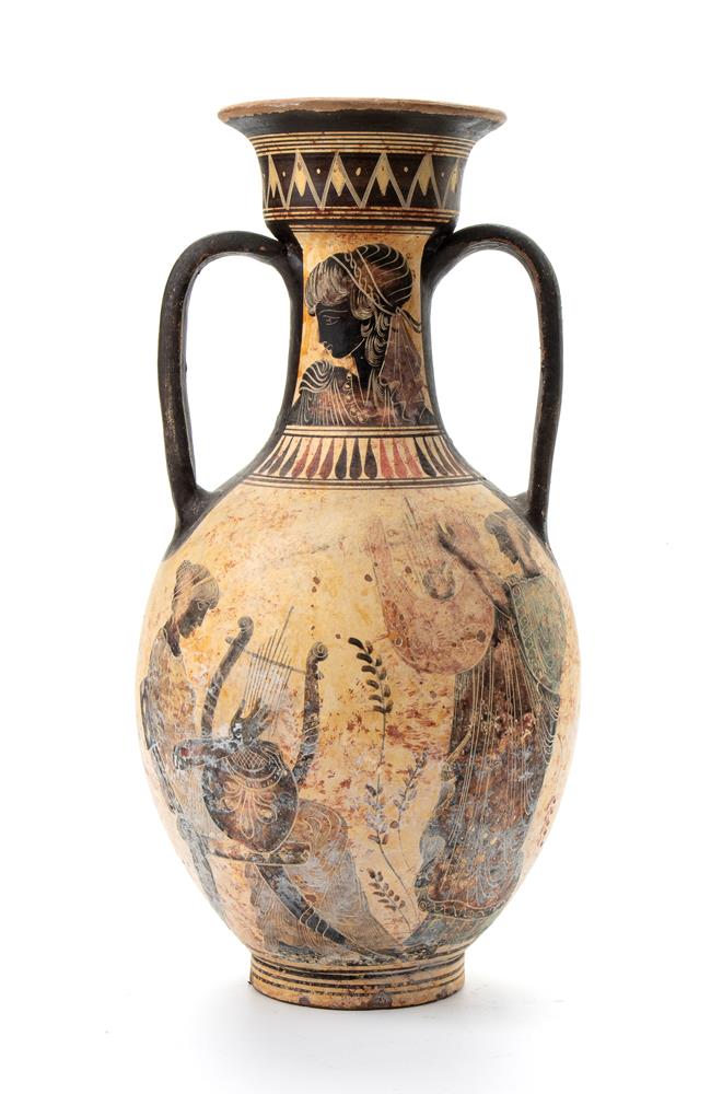 Anfora biansata in ceramica arcaica a figure nere con suonatrici di cetra nel corpo e profilo di Saffo sul collo XX secolo