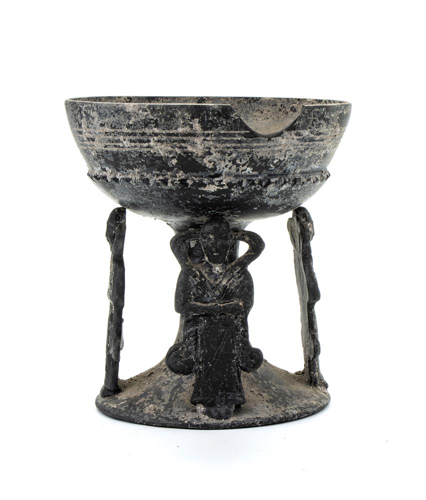 Coppa in ceramica buccheroide con sostegni antopomorfi e decori a filettature concentriche graffite