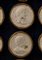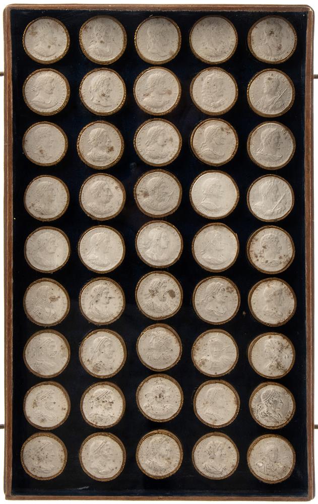 Teca in perspex laccato nero e trasparente conteneenti riproduzioni di antiche monete romane in gesso