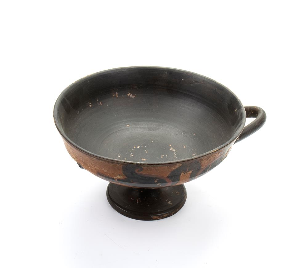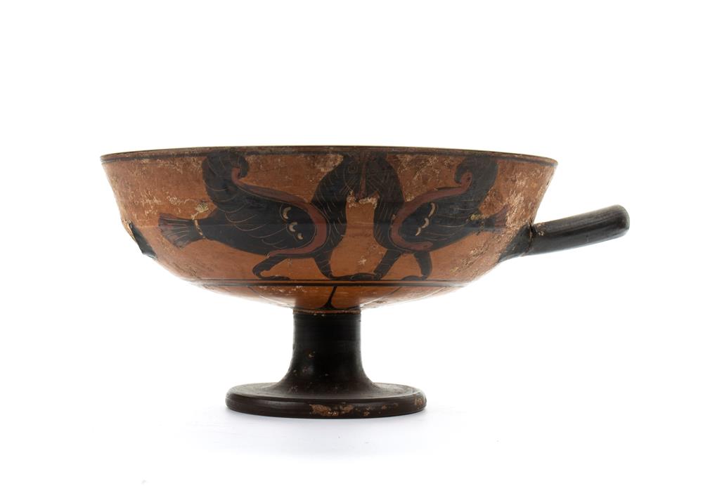 Lot 291 | Coppa biansata in ceramica arcaica a figure nere con scena di caccia al cervo e chimera