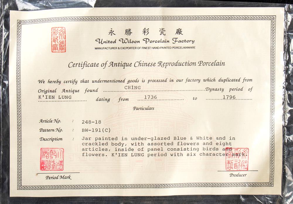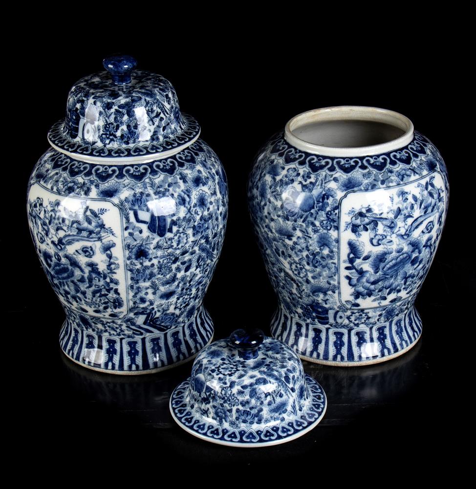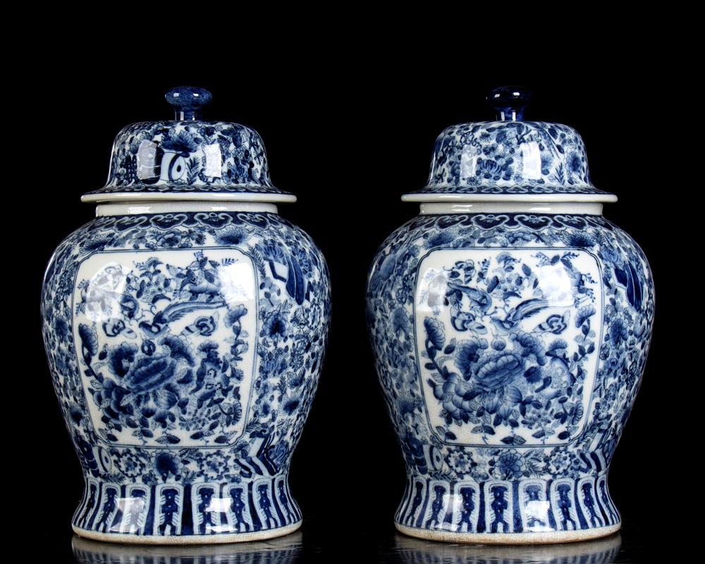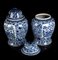 Coppia di vasi da tempio in porcellana blu e bianca con motivi arabescati e floreali XX secolo