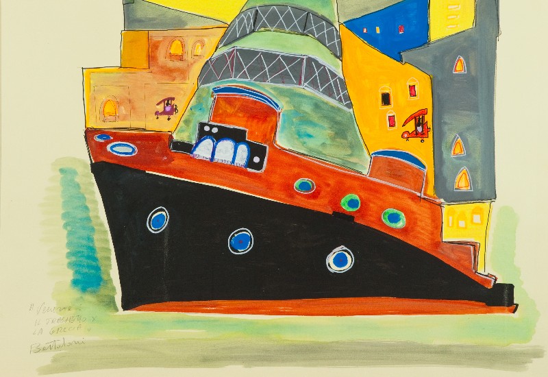 Lillo Bartoloni (Roma 1948) VENEZIA: IL TRAGHETTO PER LA GRECIA Tecnica mista su carta, cm. 70x100 Firma e titolo in basso a sinistra.