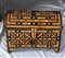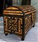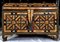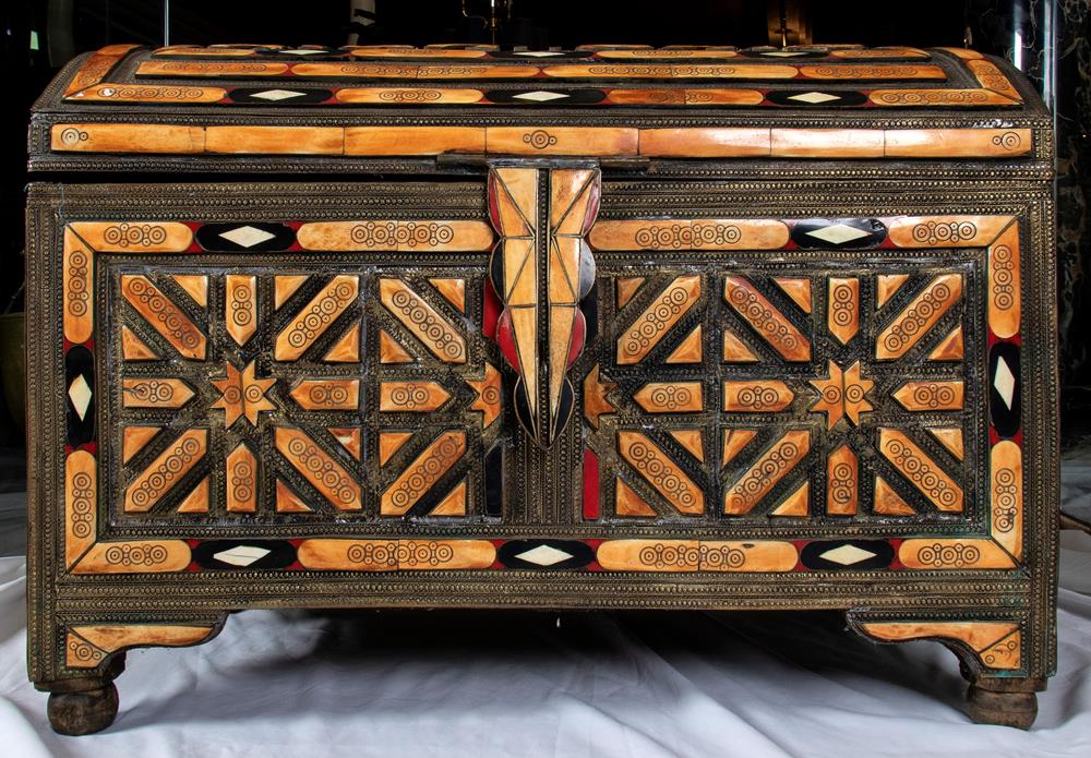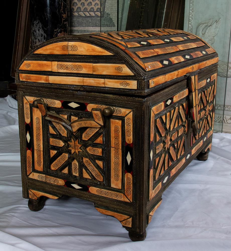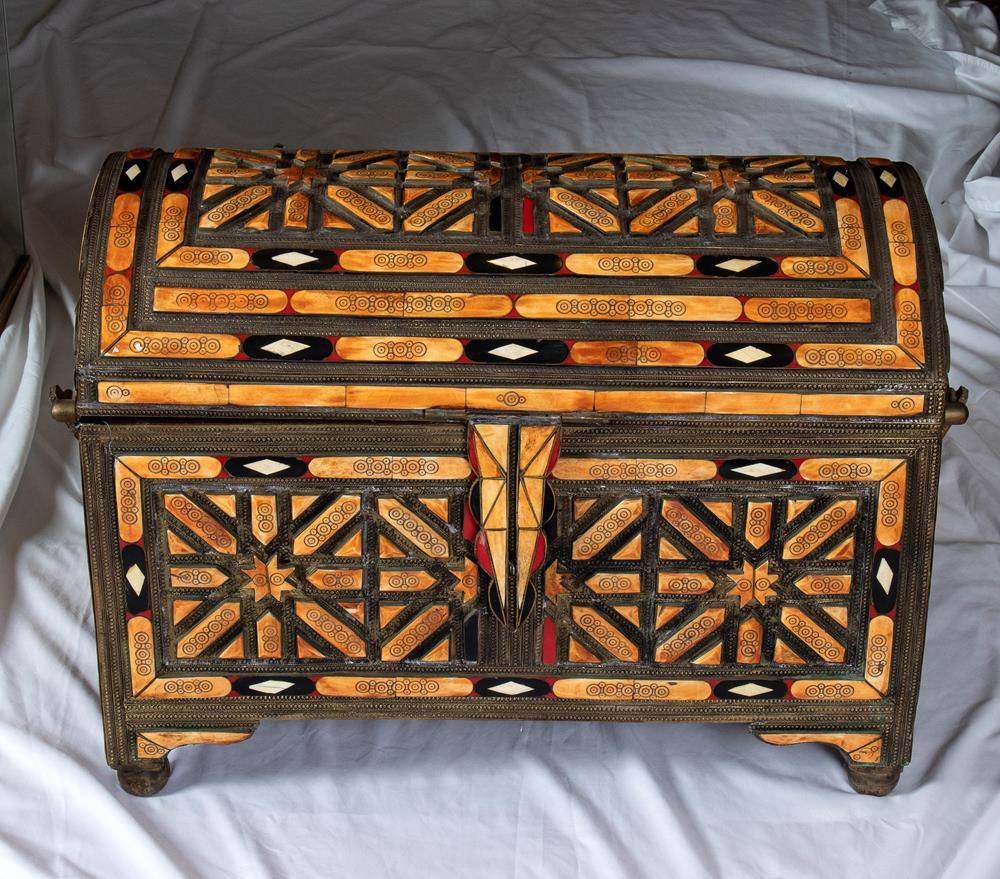 Baule di gusto arabeggiante riccamente intarsiato in legno ricoperto da lamina di ottone o bronzo borchiato e forato con elementi in osso