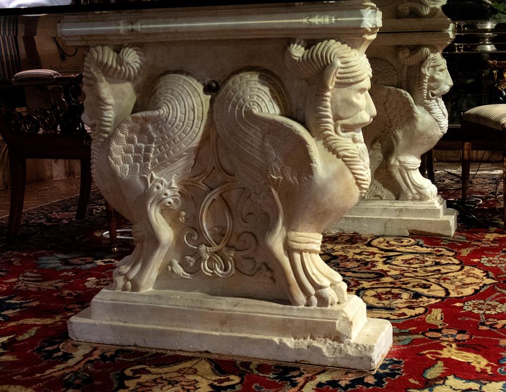 Grande tavolo con piano in cristallo e base in marmo intagliato con fiere alate bifronti