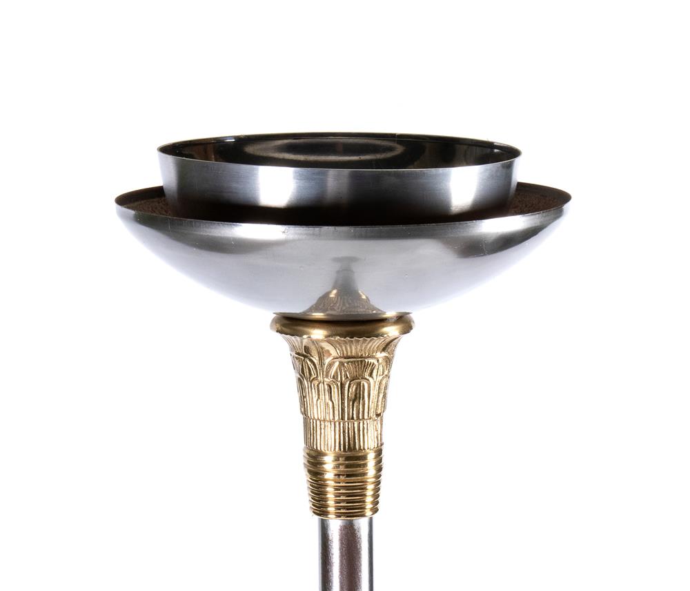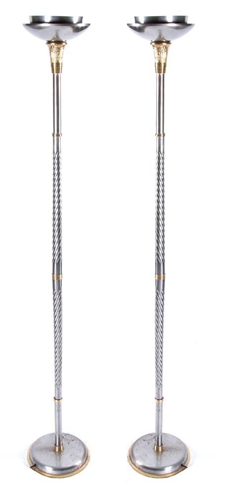 Coppia di lampade da terra in metallo argentato e dorato in stile Impero con base tonda.