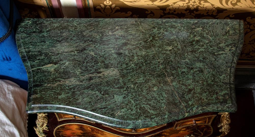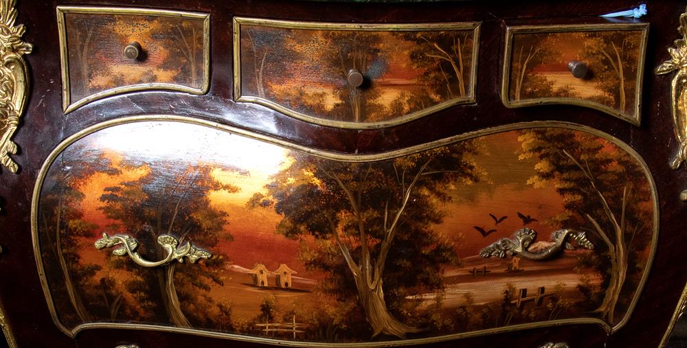 Comodino con ampio cassetto tre cassettini al fronte decorato con inserti in ottone dorato e scene di paesaggio dipinte