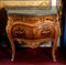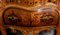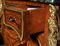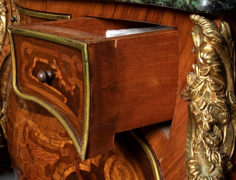 Comodino con ampio cassetto tre cassettini al fronte decorato con inserti in ottone dorato e lastronature a motivi vegetali