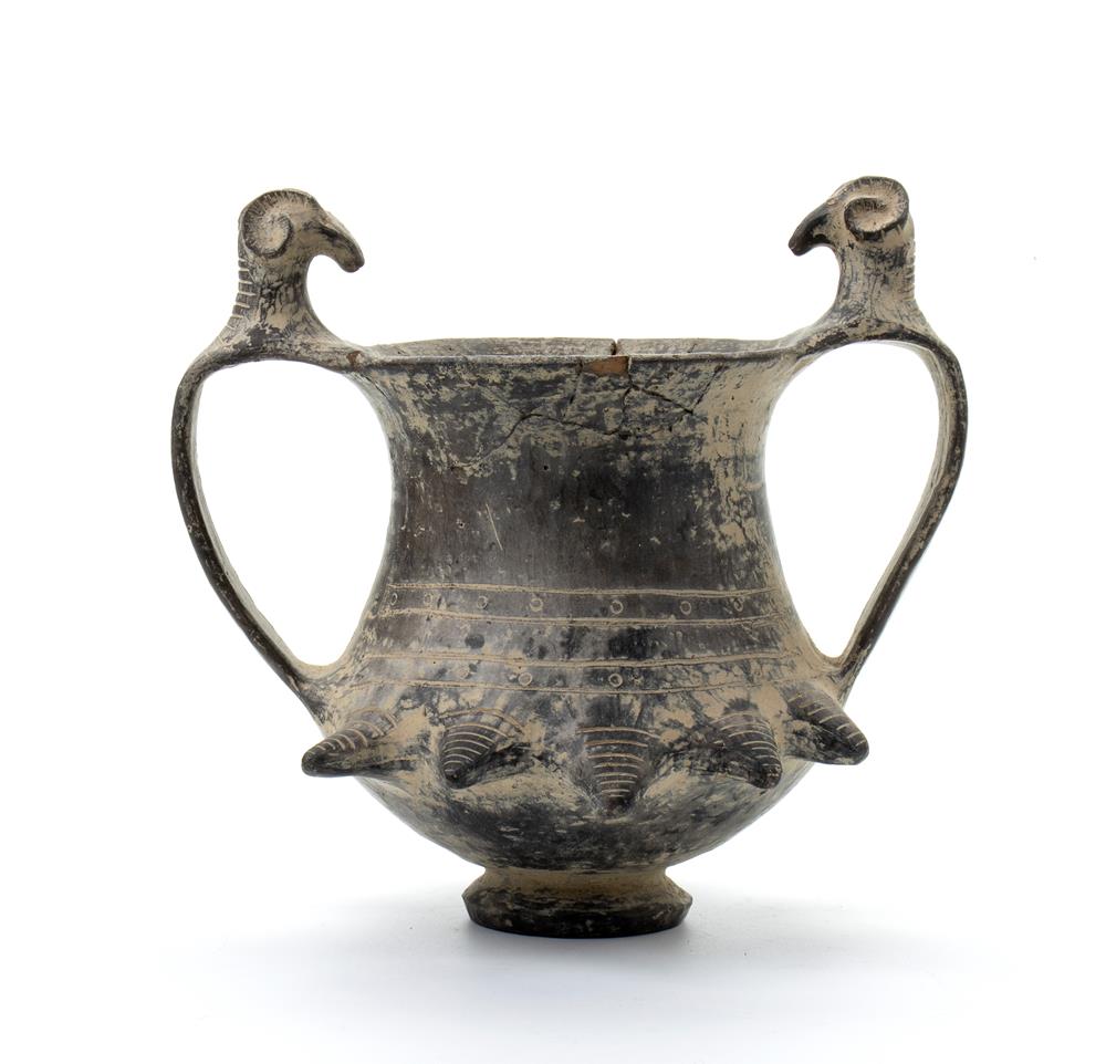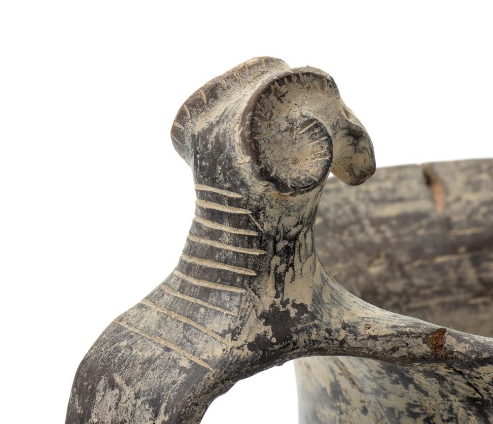 Coppa biansata in ceramica buccheroide con decori a rilievo di testa di montone sulle anse e umbonati sul corpo