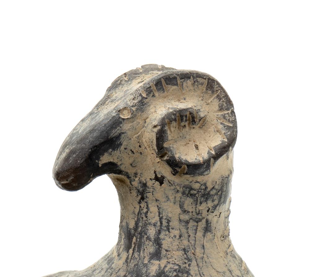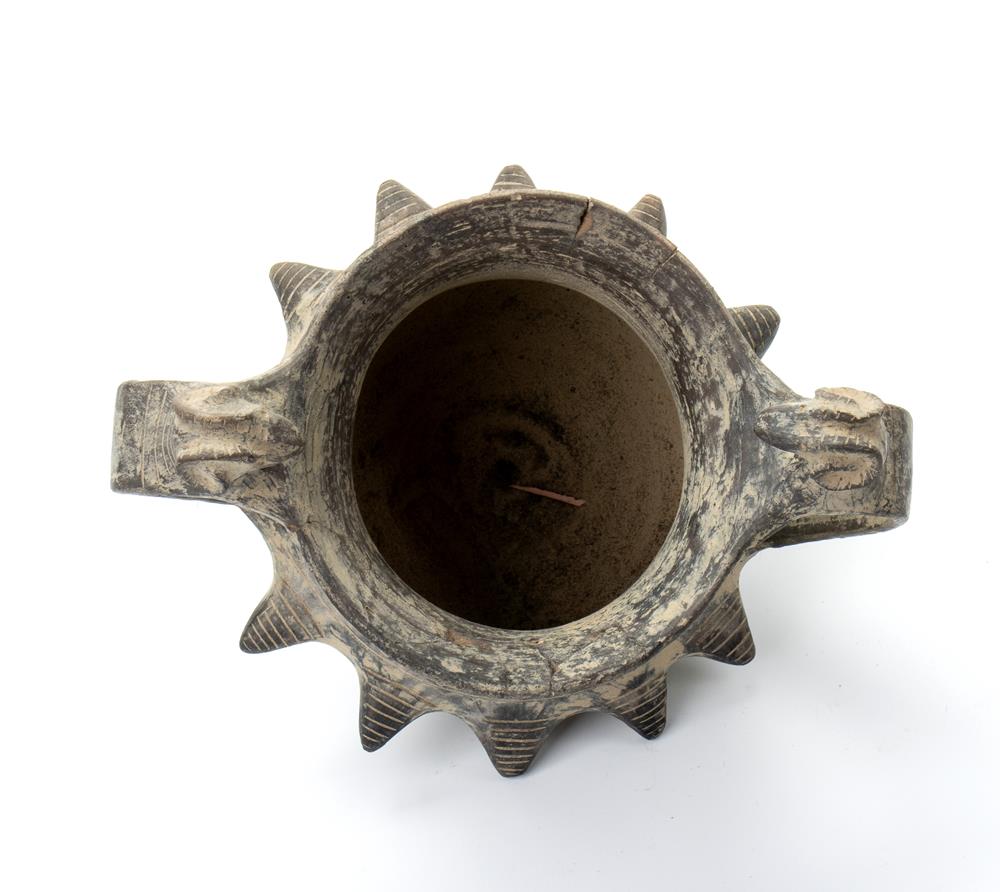 Coppa biansata in ceramica buccheroide con decori a rilievo di testa di montone sulle anse e umbonati sul corpo XX secolo