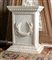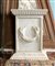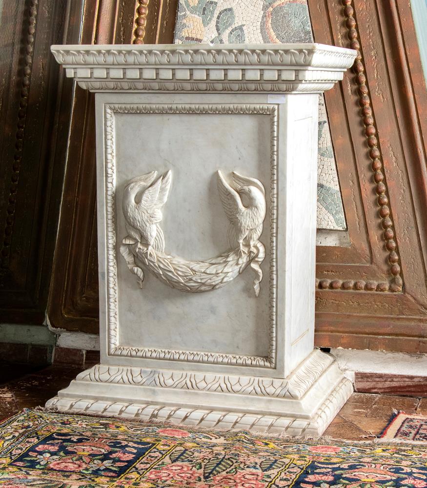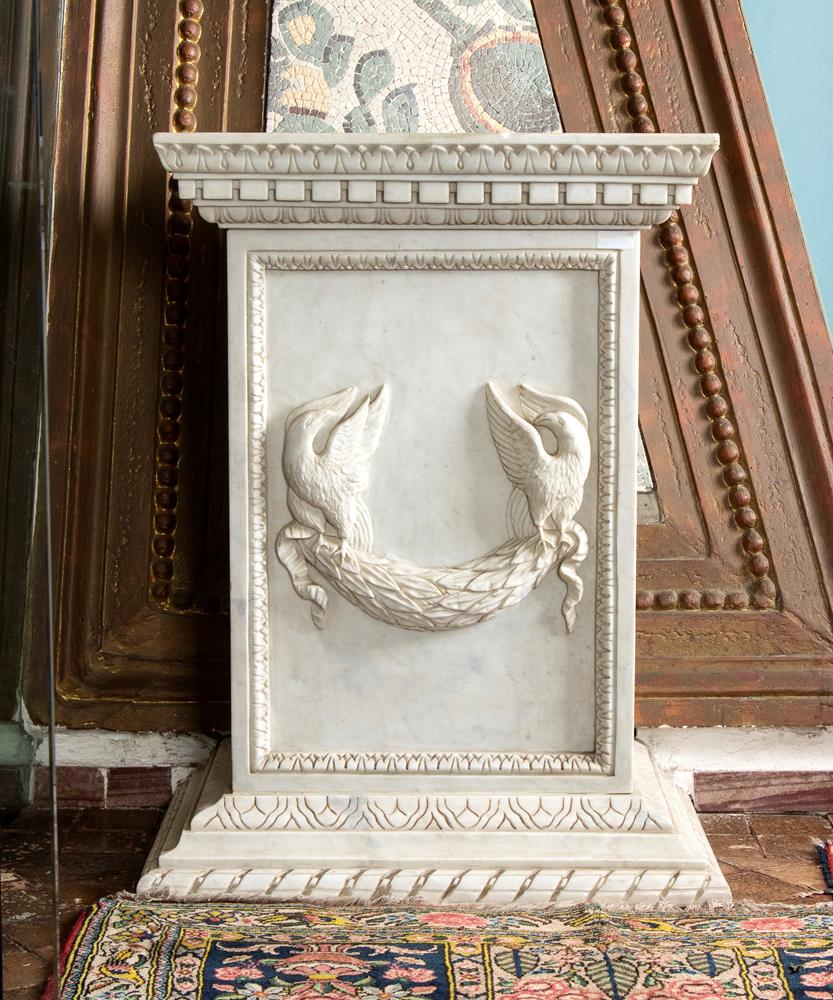 Base in marmo bianco statuario scolpito a mano dal blocco con decoro a rilievo di due uccelli stanti a trattenere tra le zampe un serto di alloro