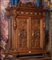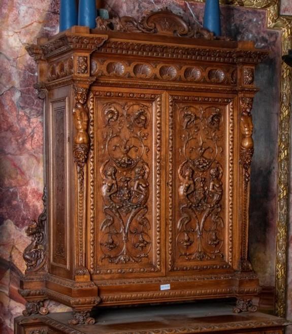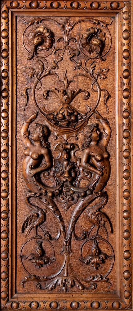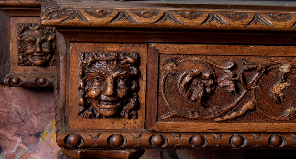 Mobile credenza a doppio sportello in noce con piedi a mensola e mascheroni; grifi laterali. Agli sportelli preziosa lavorazione a grottesche con candelabre e nudi femminili di ispirazione mitologica. Unghiature alla cornice inferire