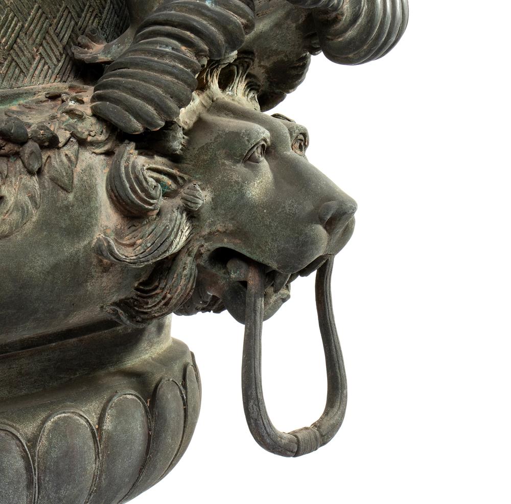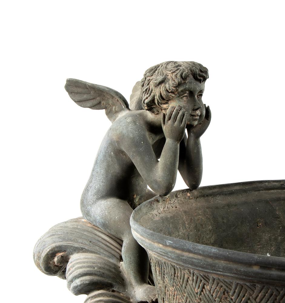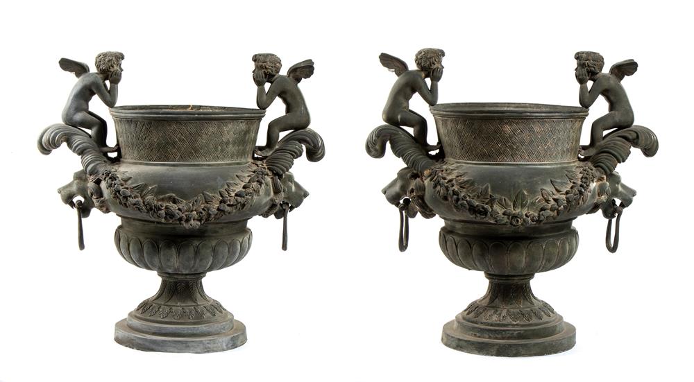 Coppia di grandi vasi bronzei con manici a guisa di leone sormontati da foglie di acanto e putti intenti a poggiare la testa sulle mani, raccordati tra loro da festoni stile impero.