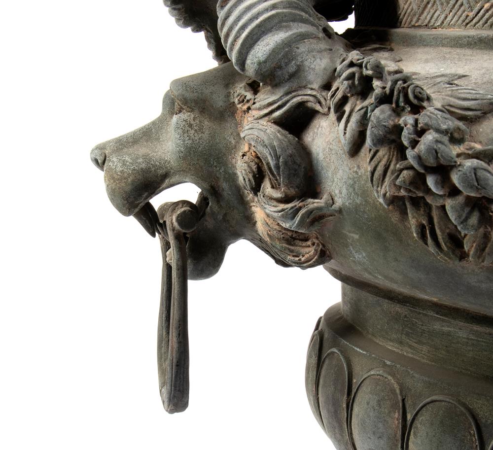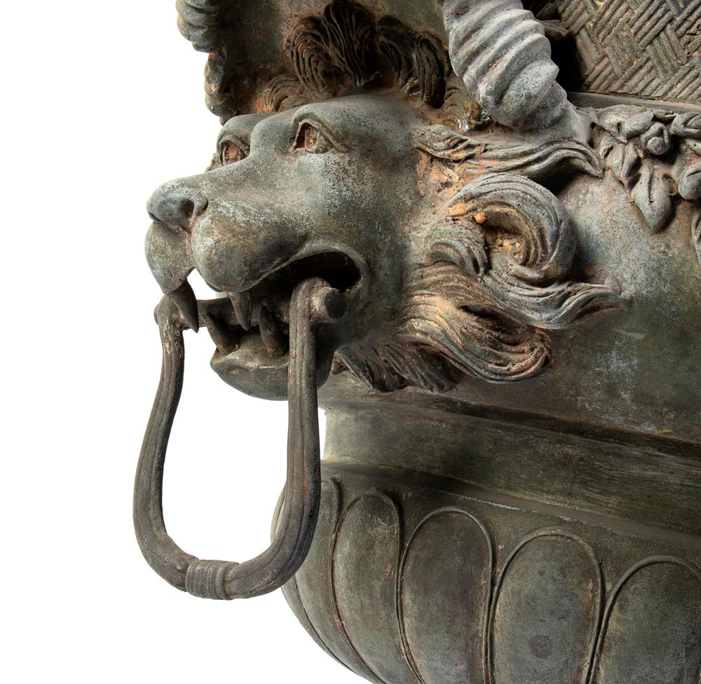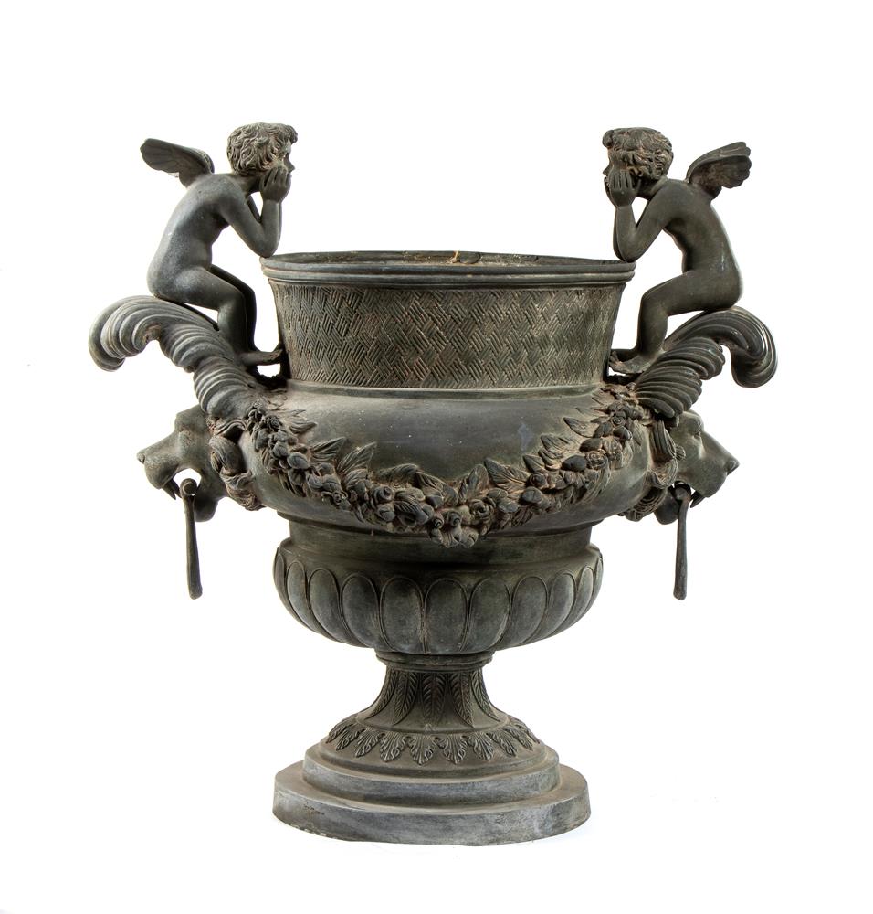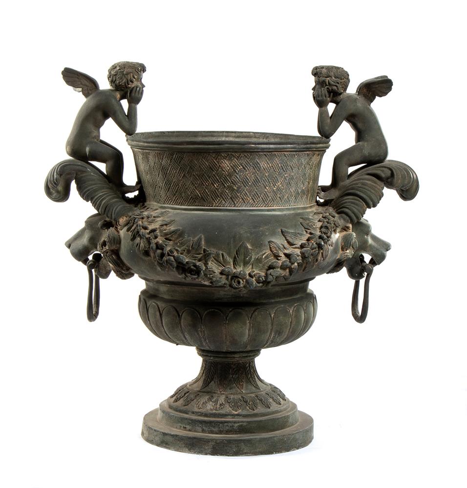 Coppia di grandi vasi bronzei con manici a guisa di leone sormontati da foglie di acanto e putti