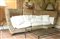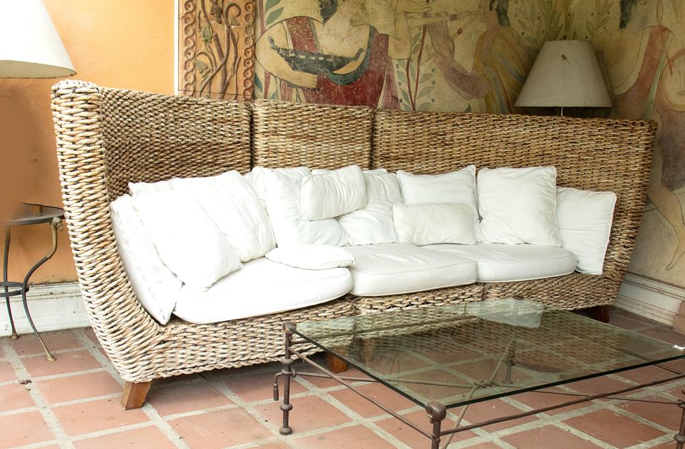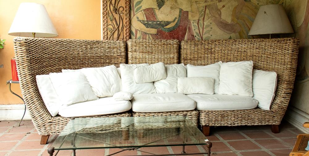 Grande divano con struttura in legno e rattan a tre moduli. Schienale curvo.