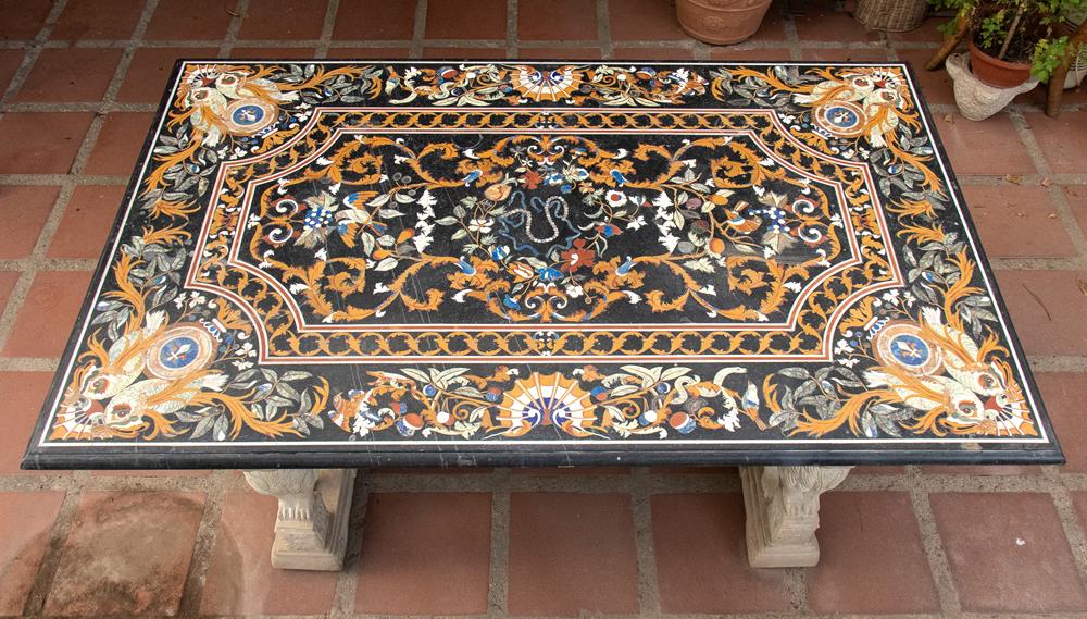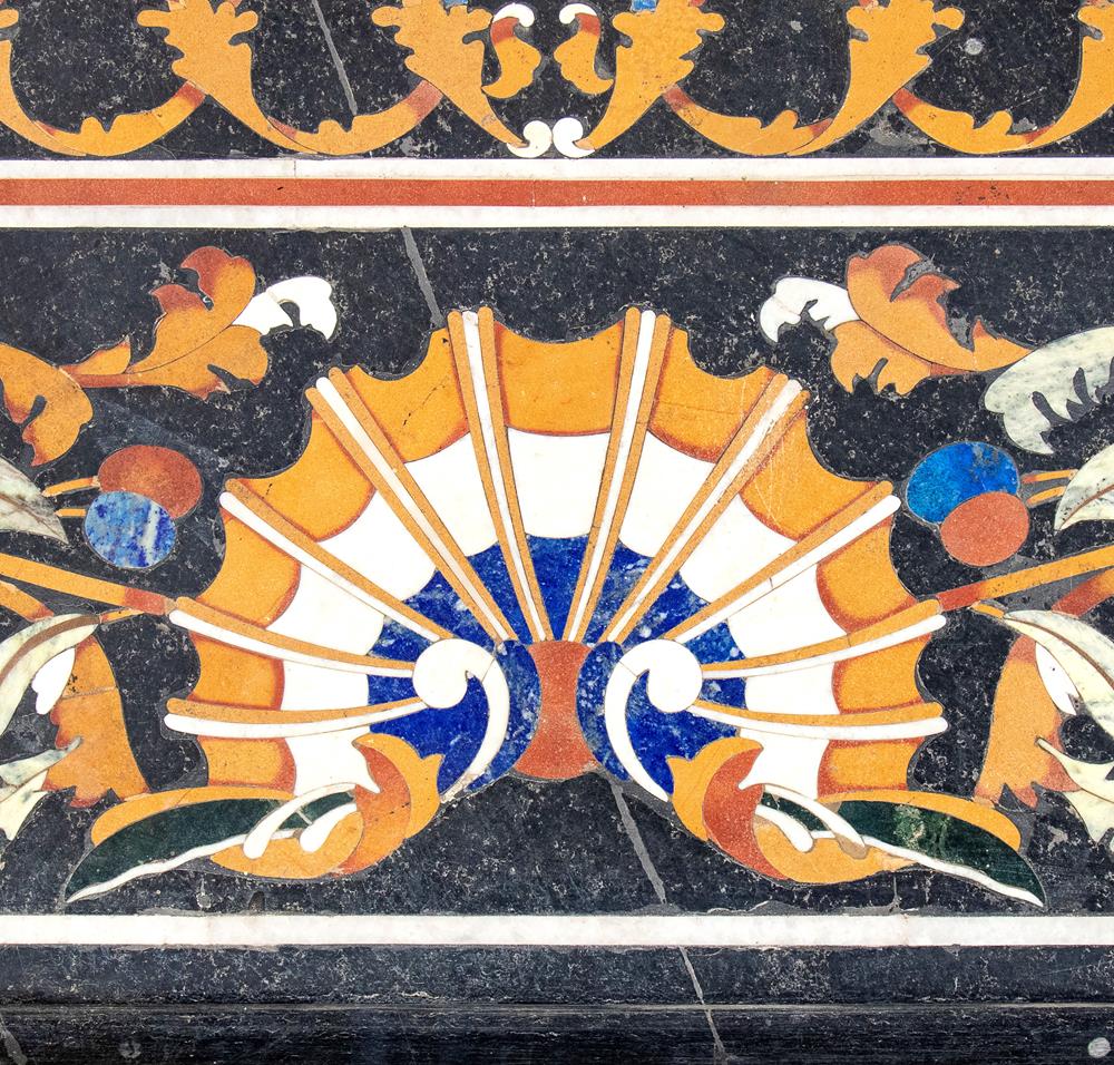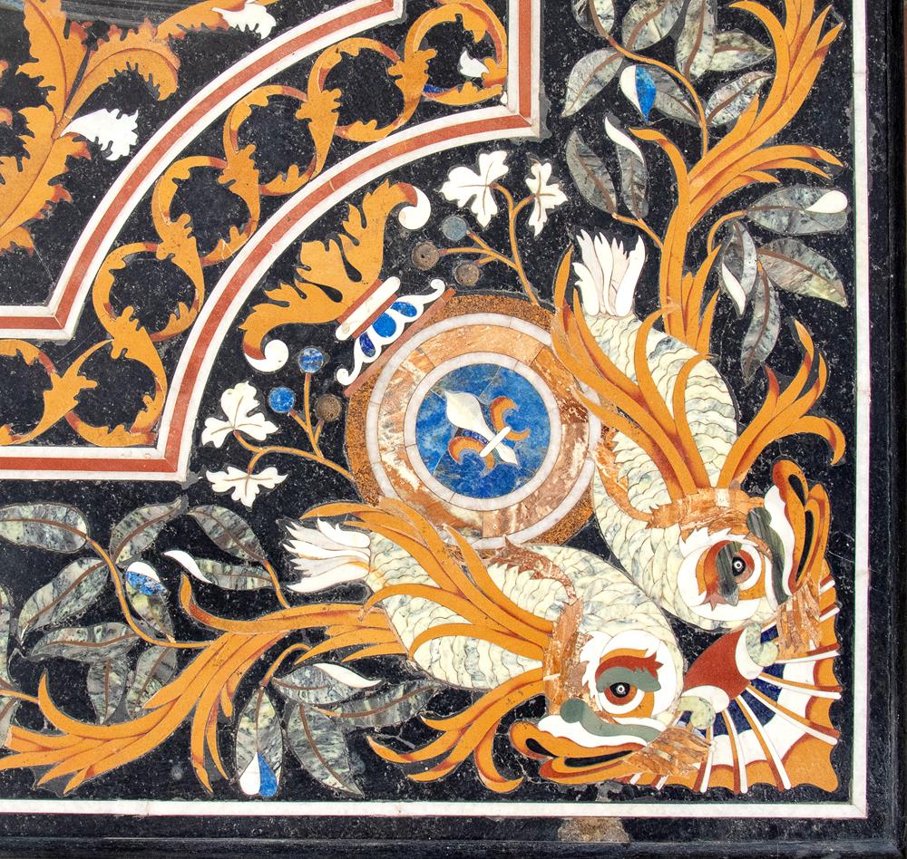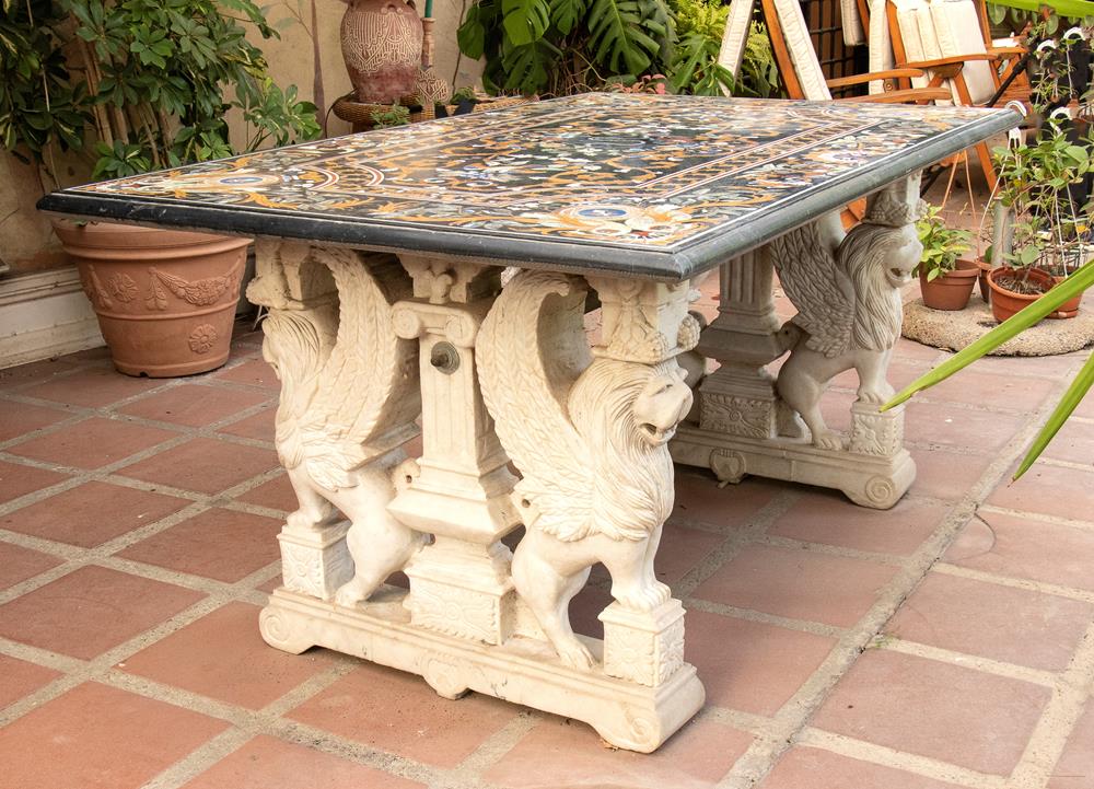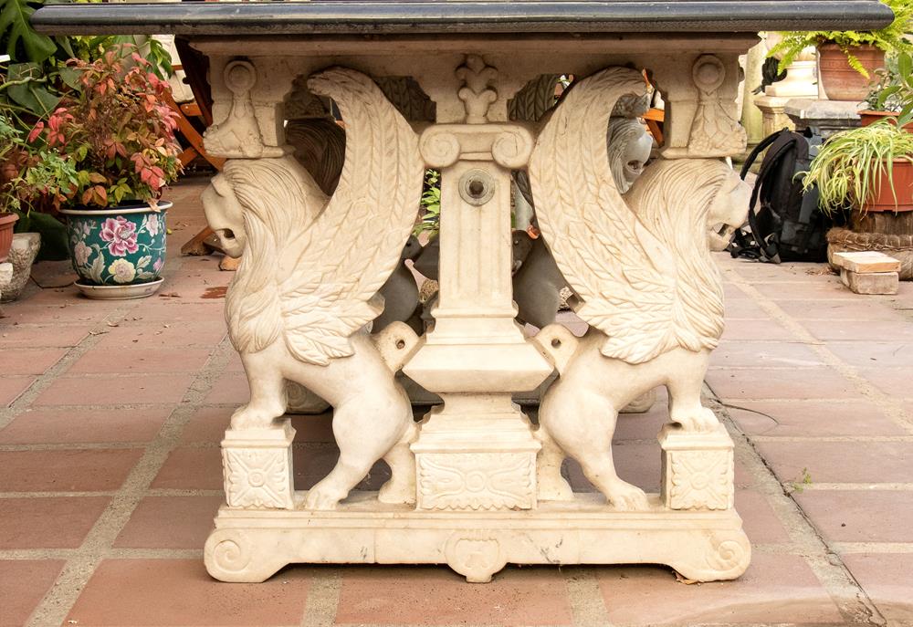 Tavolo con tramezzofori in marmo statuario bianco realizzati a coppia bifronte di leoni alati divisi tra loro da una colonna scalanata con grande base e capitello. Piano in marmo nero intarsiato in pietre dure e motivo a neobaroccoi