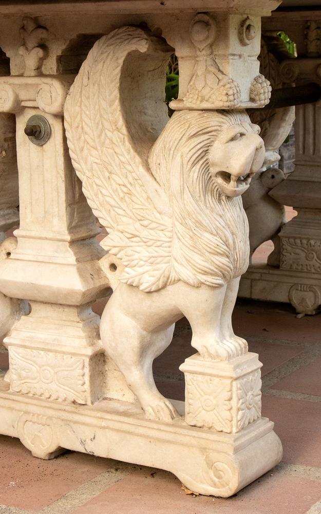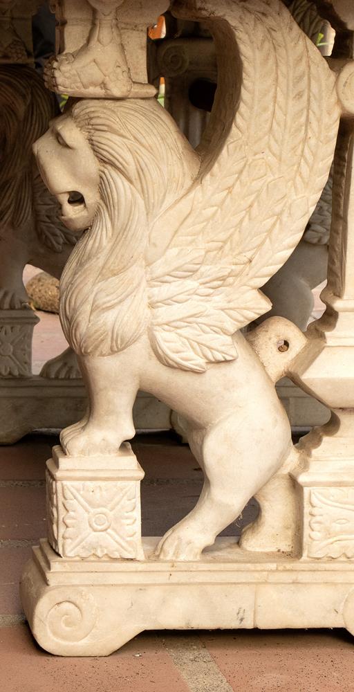 Tavolo con tramezzofori in marmo statuario bianco realizzati a coppia bifronte di leoni alati