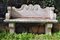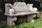 Coppia di panchine da giardino in polvere di cemento e marmo con schienale sagomato, braccioli e piedi a grandi volute