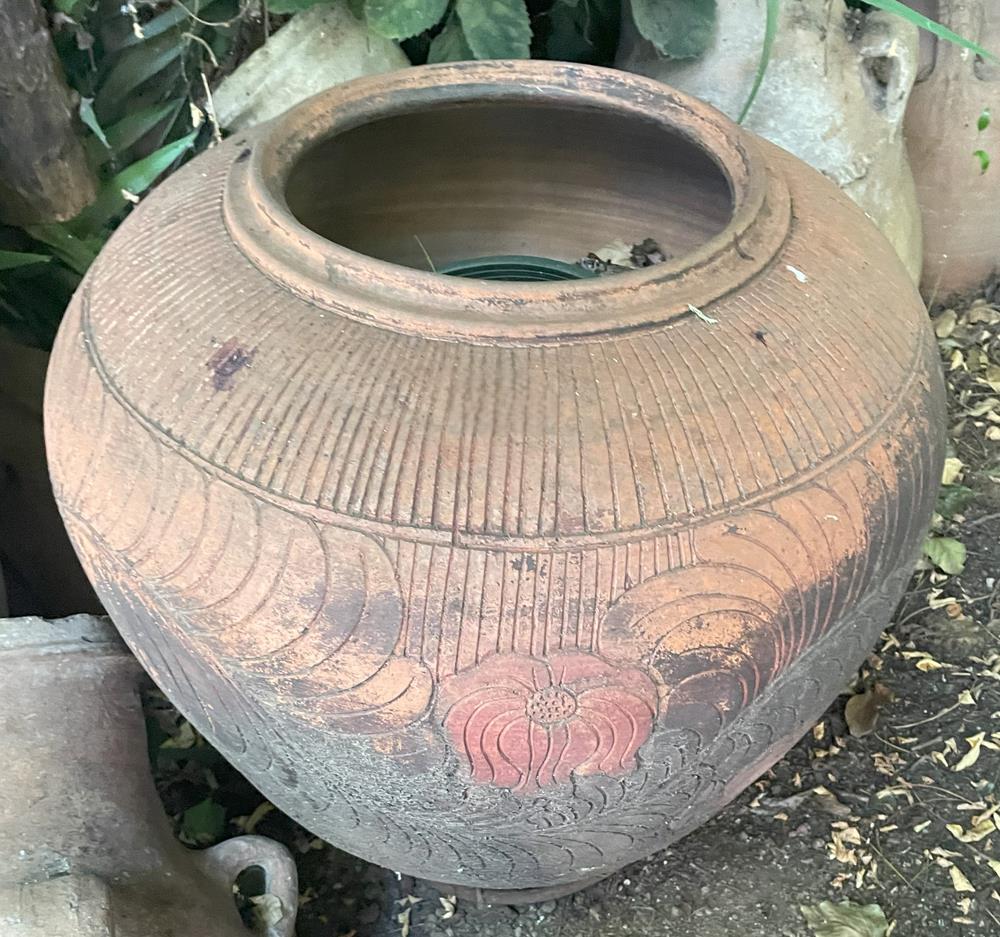 Grande orcio in terracotta con rastremature verticali e decorazioni floreali incise XX secolo