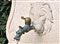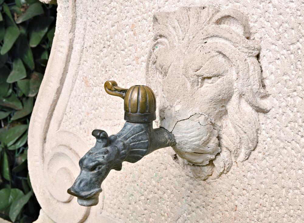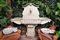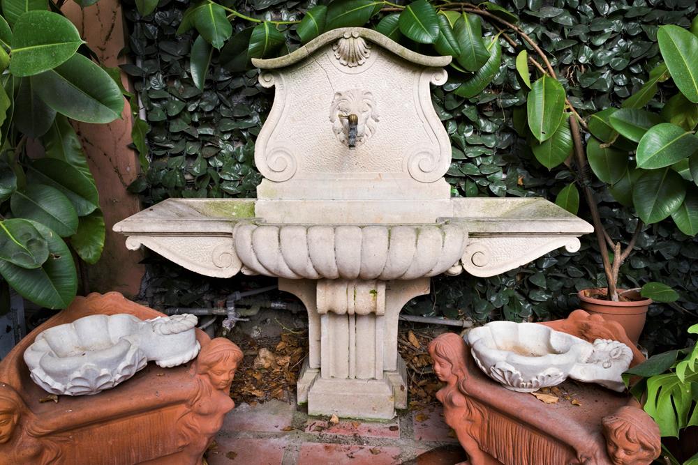 Fontana in marmo bianco a vasca unica arricchita da volute laterali e conchiglia centrale.