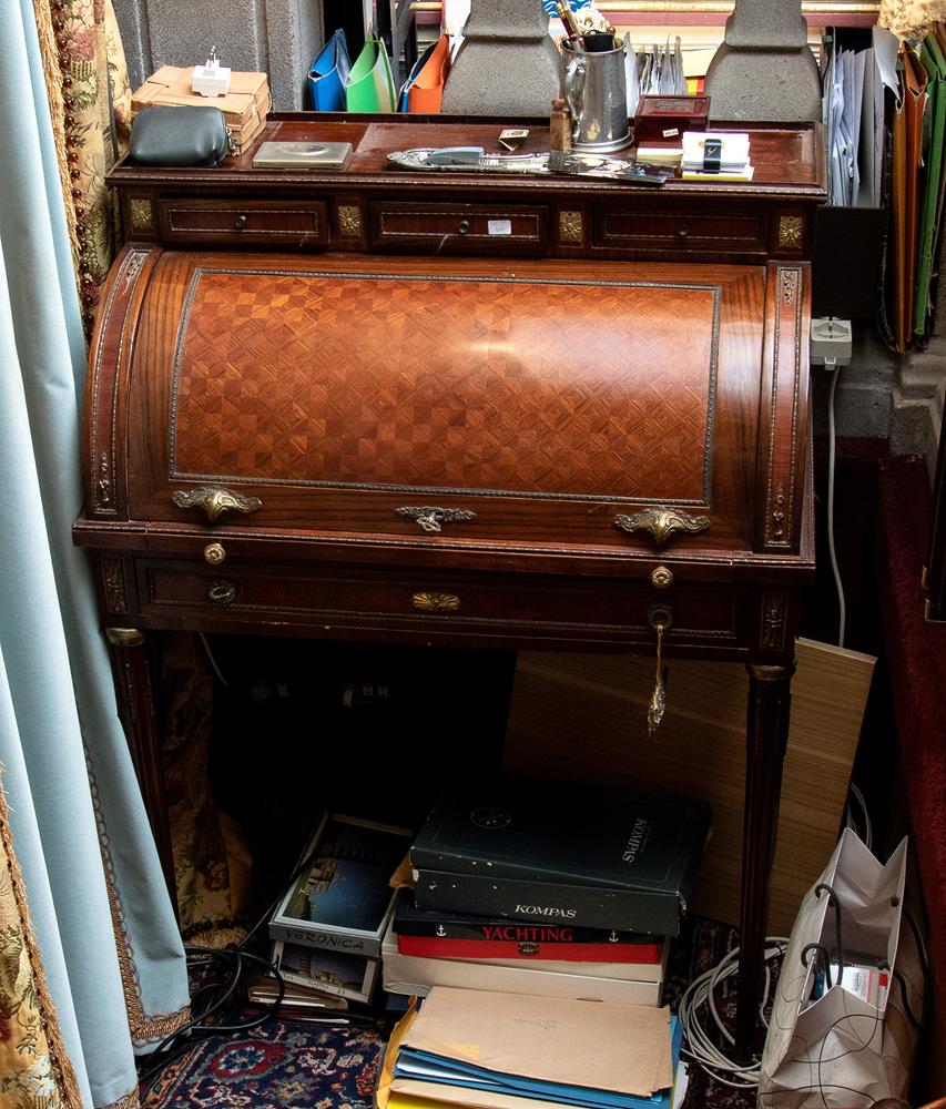 Presenta nella parte superiore tre piccoli cassetti alternati da quattro inserti fiissi in ottone e in quella inferiore unico cassetto.