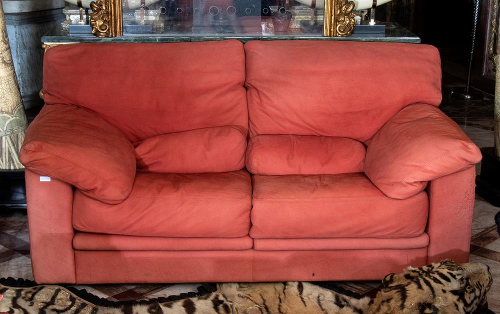 Lot 550 | Divano 2 pp color corallo + due cuscini laterali zippati ai braccioli e due cuscini cilindrici; poggiatesta regolabile