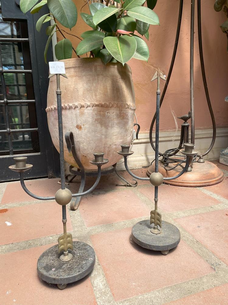 Coppia di candelieri a due fuochi con centrale a guisa di freccia