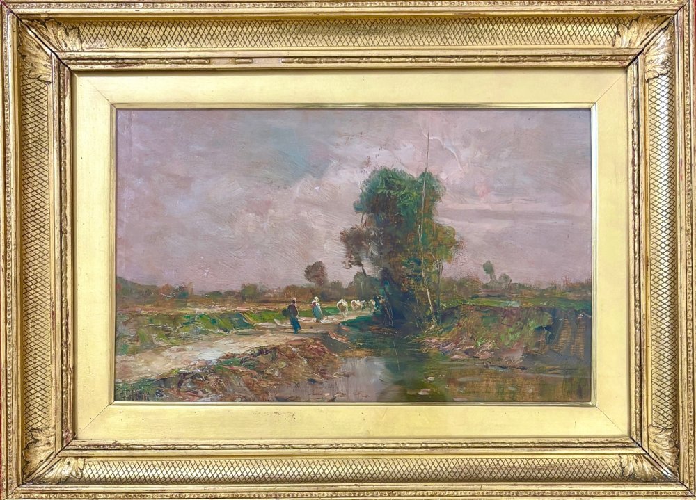 Carlo Follini Domodossola (VB) 1848 - 1938 Genova Pegli Paesaggio con figure Olio su tavola cm 29,5x44 firmato in basso a sx