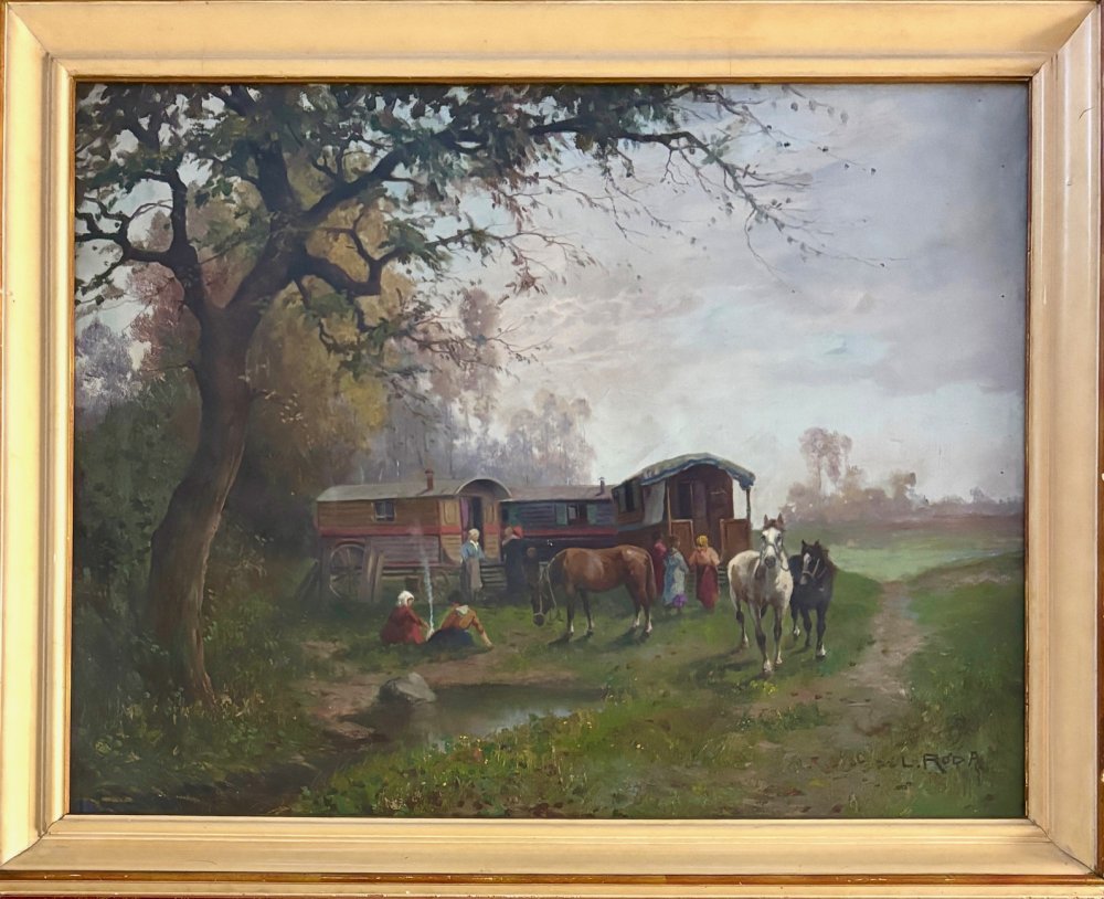 Leonardo Roda Racconigi 1868 -1933 Torino La Carovana del circo Olio su tela cm 72x92 firmato in basso a destra
