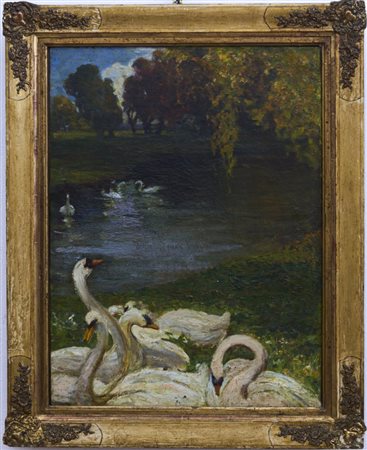 Attr. Luigi Rossi Lugano 1853 - 1923 Studio per l'opera la Guardiana dei Cigni Olio su tela cm 60x40,5 firmato al retro sul telaio