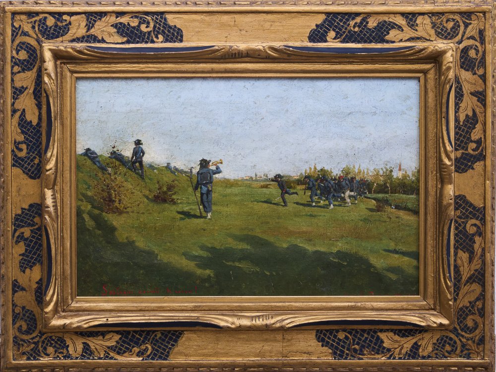 Romolo Tessari Castelfranco Veneto (TV) 1868 - 1925 Mira (VE) La carica dei Bersaglieri Olio su tela applicata su cartone cm 24x36,5 firmato in basso a dx datato 1891