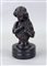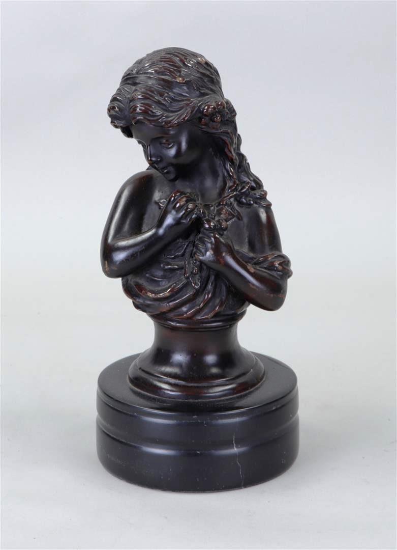 A bronze bust of a young girl with bunch of grapes mounted on a honed stone base. Unclearly signed (under right arm). 19th century.