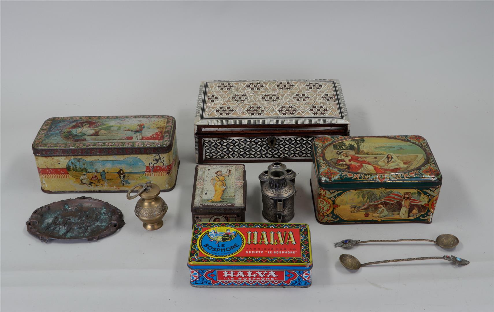 A large lot of various Oriental and Asian objects in copper, including various storage tins.