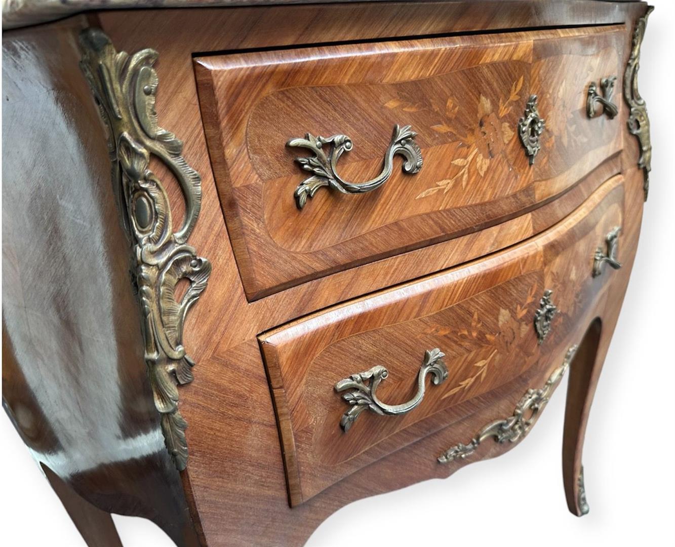 A Louis XV style chest of drawers with brass frames and intarsia.